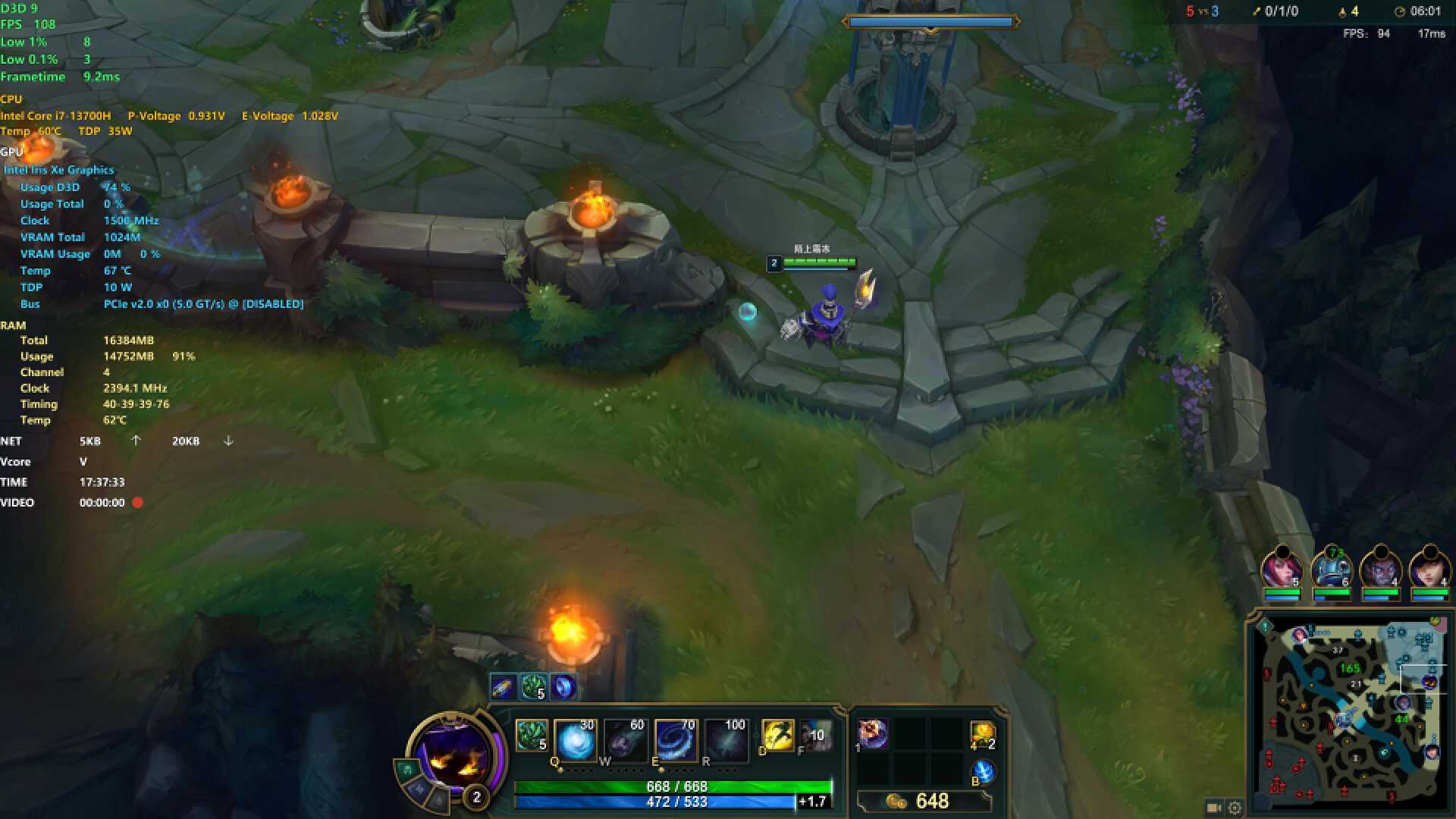 ▼华硕破晓X mini 在 4K 分辨率、高画质下,泉水附近有120+ FPS,移动平均帧率为 105+FPS,对线时帧率在 80+FPS 左右,可以很流畅进行游玩。如果对帧率要求高,可以适当降低分辨率和画质。