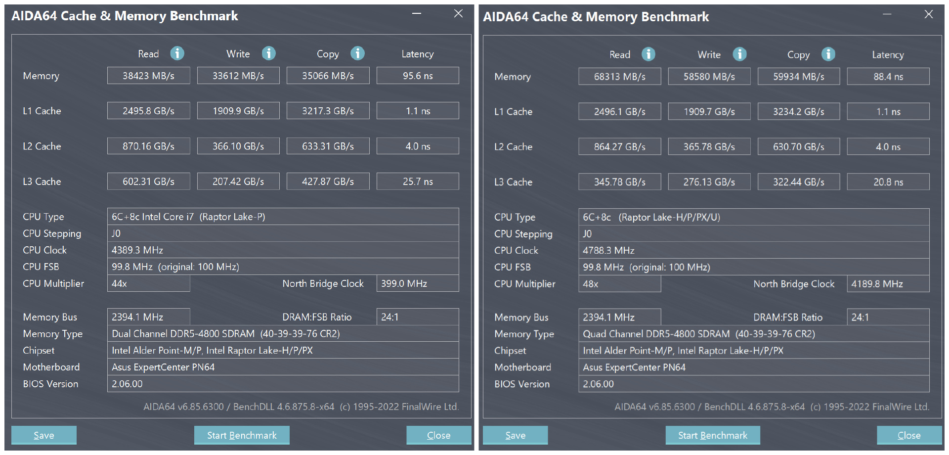 ▼众所周知,双通道对内存性能有一定提升,而 DDR5 平台更为看重这个特性。下面两张图就是 16G/8Gx2 对比,可以看到容量不变、频率不变的情况下,双通道几乎提升了一倍性能。