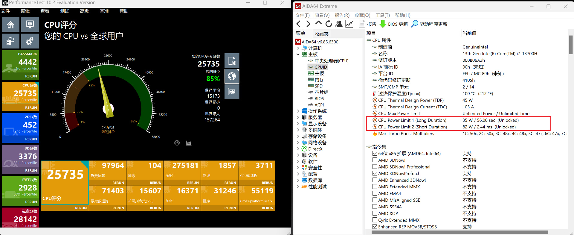 ▼PerformanceTest 测试,CPU 得分 25735,不算太高,这和华硕调教偏保守有和大关系。从 aida64 可以看出默认状态 L1 TDP 仅为 35W,L2 TDP 也才 82W,后续可以利用 Intel 的XTU 工具调整。