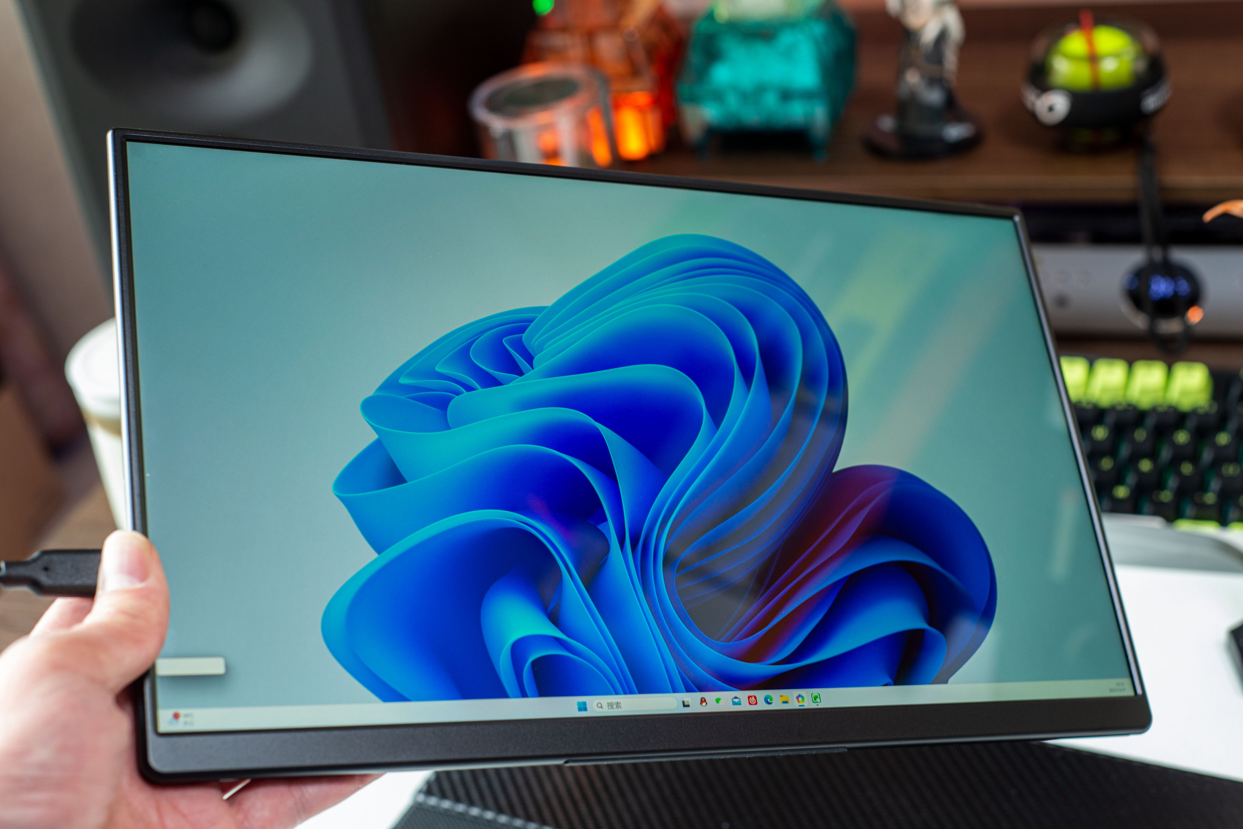 ▼当然最重要的还是重量了。14英寸的便携屏重量只有 480g,第一次上手轻巧的手感简直有点吓人。另外便携屏还配了个磁吸皮套,既是保护壳同时承担了支架的作用,实用性很高。