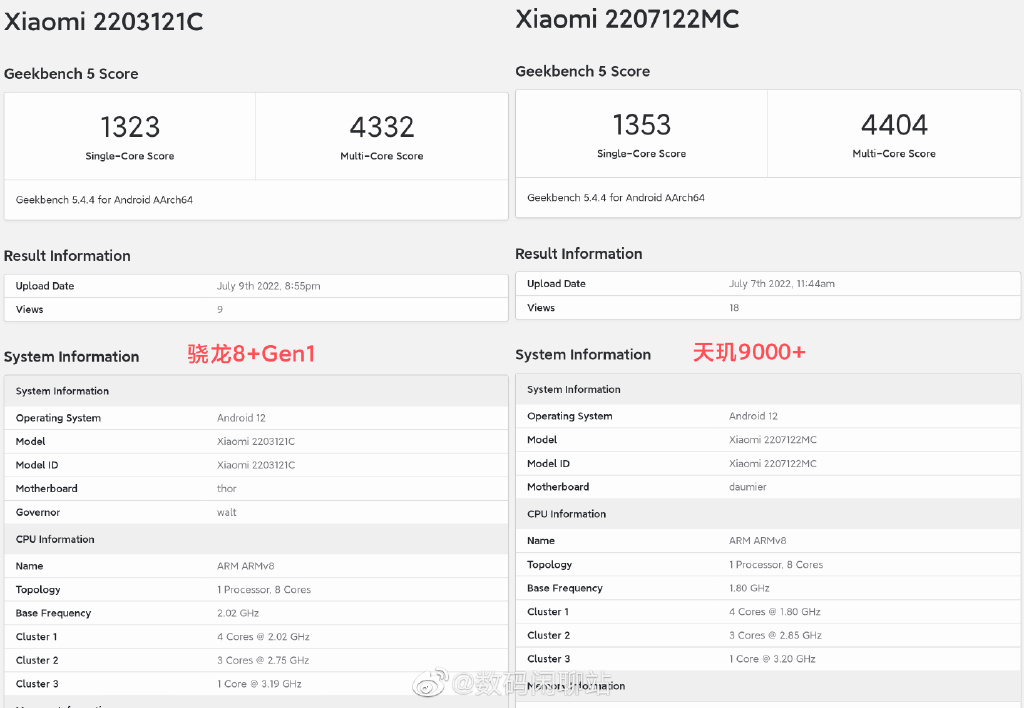 作爲對比,驍龍 8 + 和天璣 9000 + 的跑分如下,可見 A16 仿生芯片無論是單核成績還是多核成績都大幅領先安卓陣營的競爭對手。