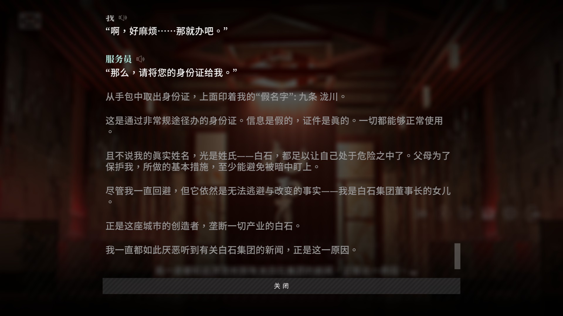 这就产生一个问题,白石集团应该比《赛博朋克2077》的荒阪公司还要更有权势,先假定女主父母不管女主,但女主有一个忠心耿耿的管家,给管家的描述也是白石集团实际的掌权人。那么在女主感知到危险已经发出求救信号的情况下,管家居然没有派人保护。如果第一次可以用大意解释的话,在已经调查出九霄惨案与黑帮有关之后艾普曼居然还没有进行一点防备,没有进行任何安保加强。被神安排照顾自己女儿的管家居然连这点危机意识都没有,这是我无论如何都想不通的,为了完成剧情强行把故事中的角色降智未免太都合主义。