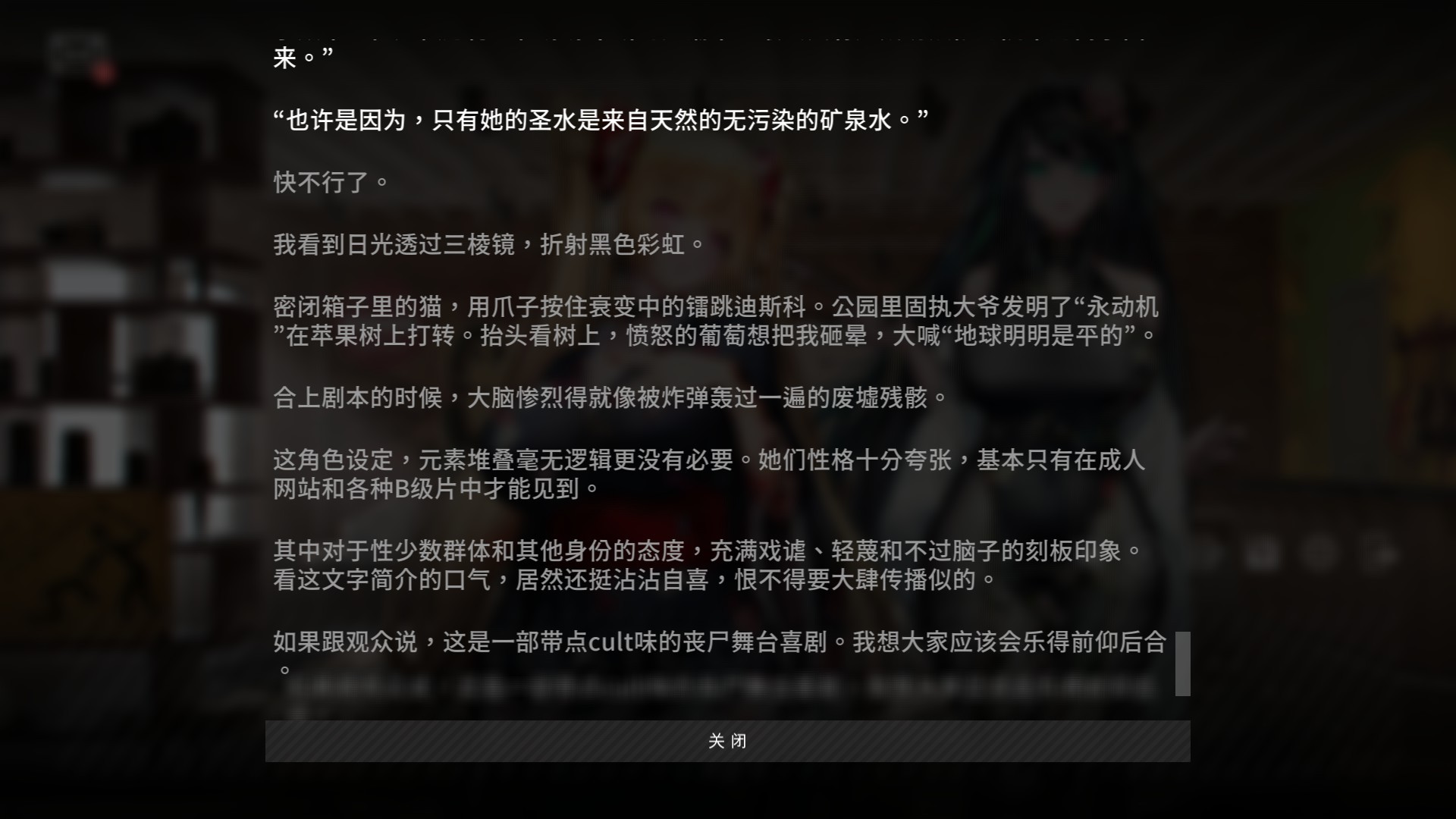那么谈到《彷徨之街》的实际剧情,我对制作组的剧情安排并无意见,怎么安排剧情是创作者的自由,我也没抱着百合贴贴心态来玩游戏。牺牲一些剧情中的配角甚至部分主角来推动故事算是比较常用的手段,看着之前有说有笑的几个伙伴相继离去也确实能充分调动玩家的情绪。