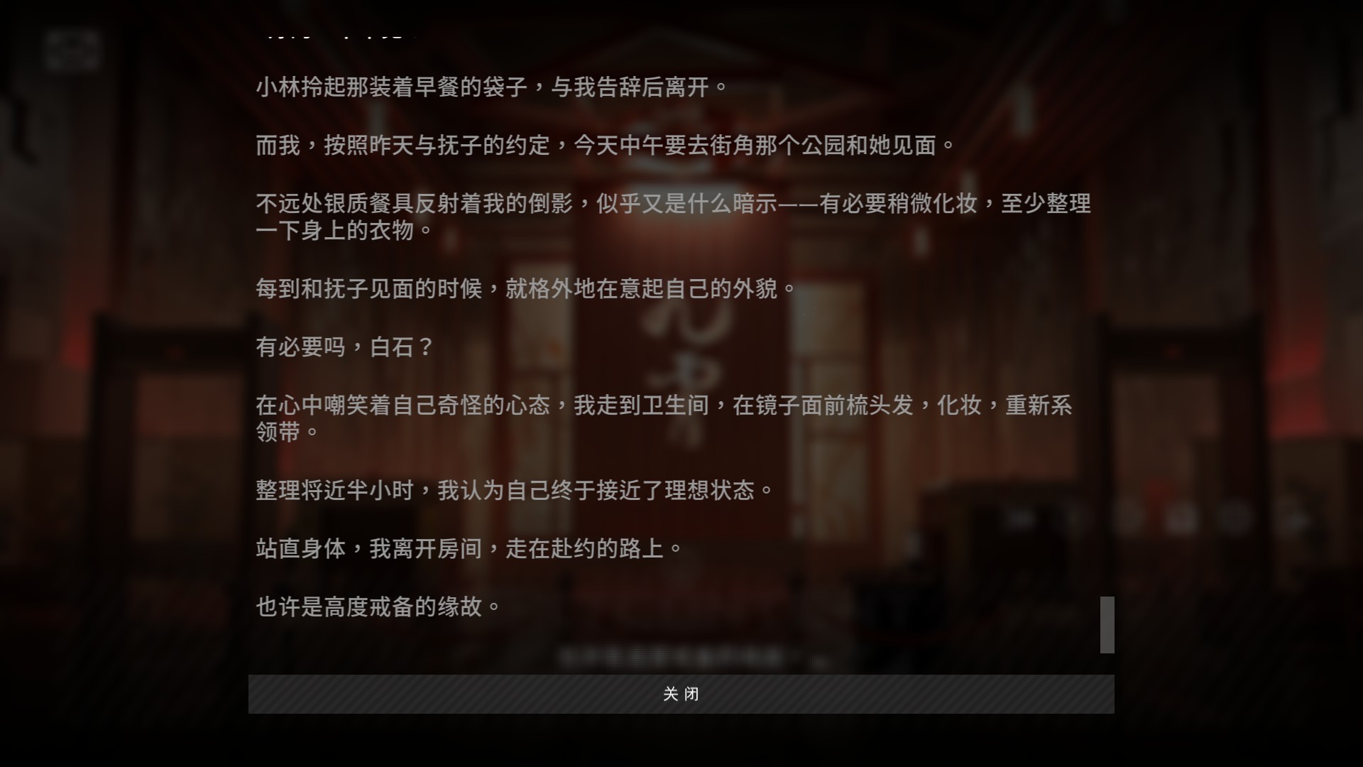 最后说说《彷徨之街》EA阶段的致命问题,《彷徨之街》的文字过于卖弄文采华而不实,这对我的游戏体验产生了毁灭性的打击。制作组太执着于让所谓文采,用了相当多的心理描写和场景描写。这些文字有没有文采暂且不论,文采只能在故事优秀的基础上进行升华,目前的情况是制作组连故事都没做好就想着升华,自然只能做些无用功。