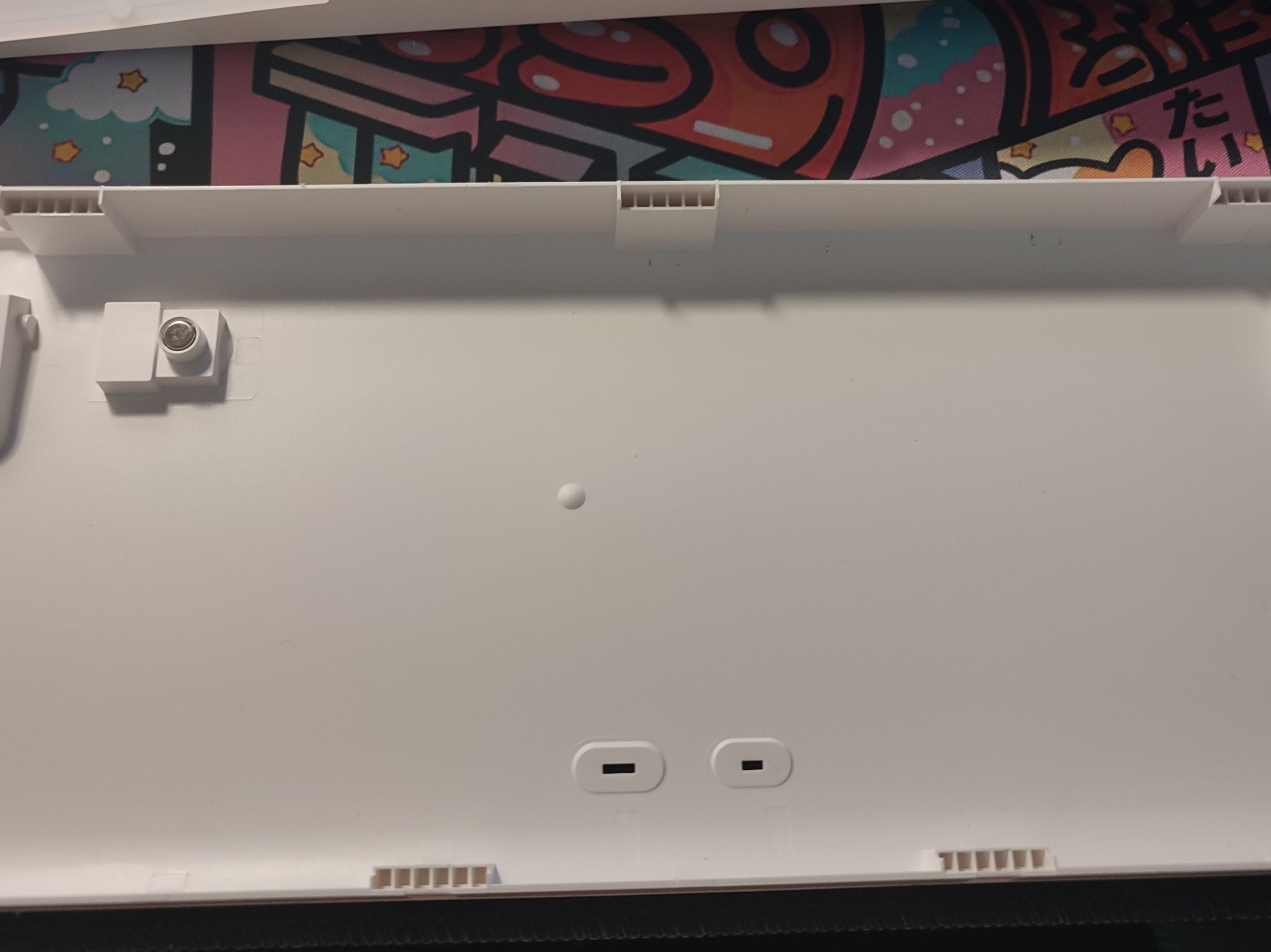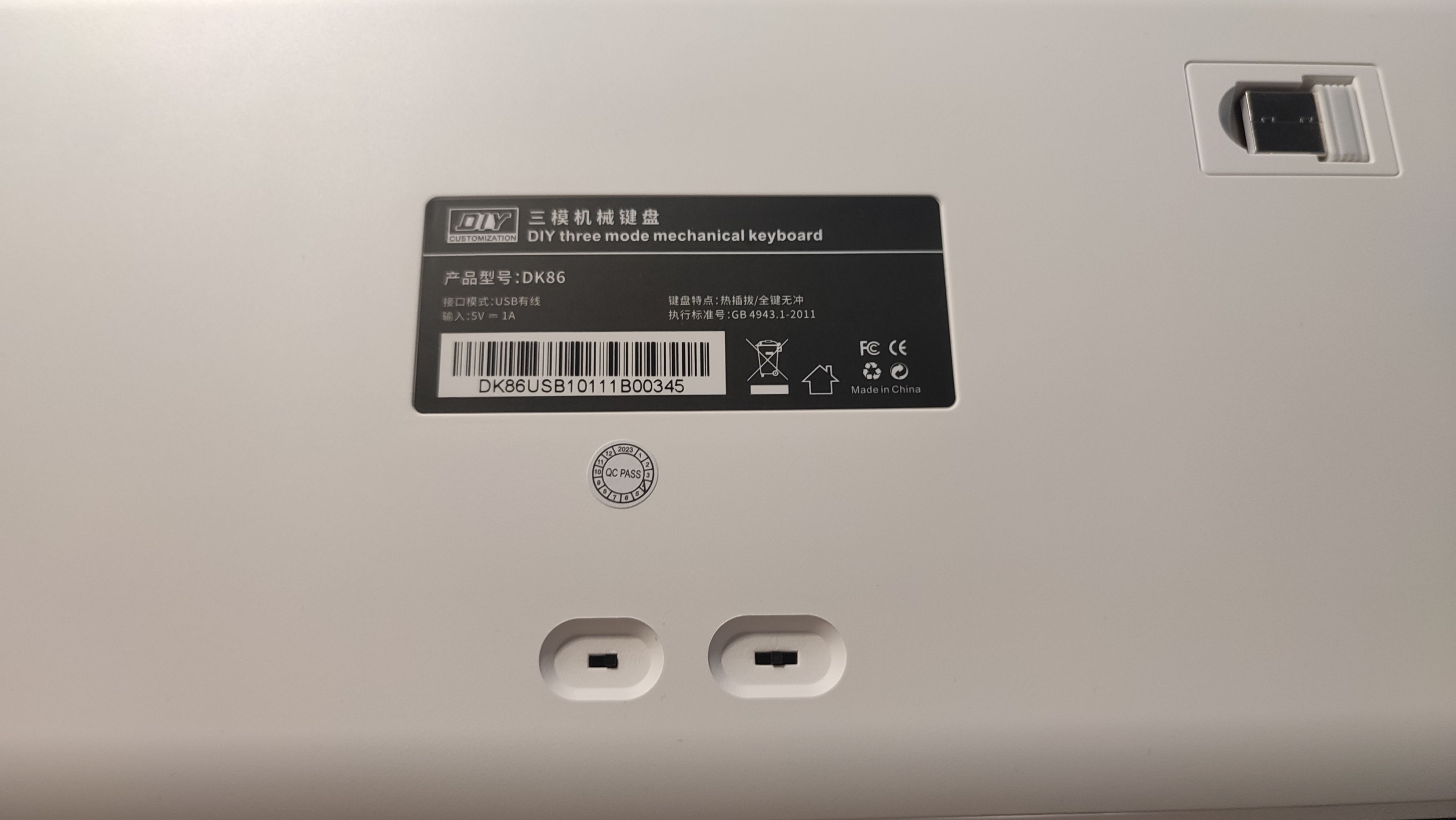 背面首先映入眼簾的就是中間的貼紙,作爲全白套件中唯一的黑色非常顯眼,上邊有一些鍵盤的基本信息;正下方就是鍵盤的兩個開關,其一是win和mac的系統切換開關,另一個則是三模連接切換開關。