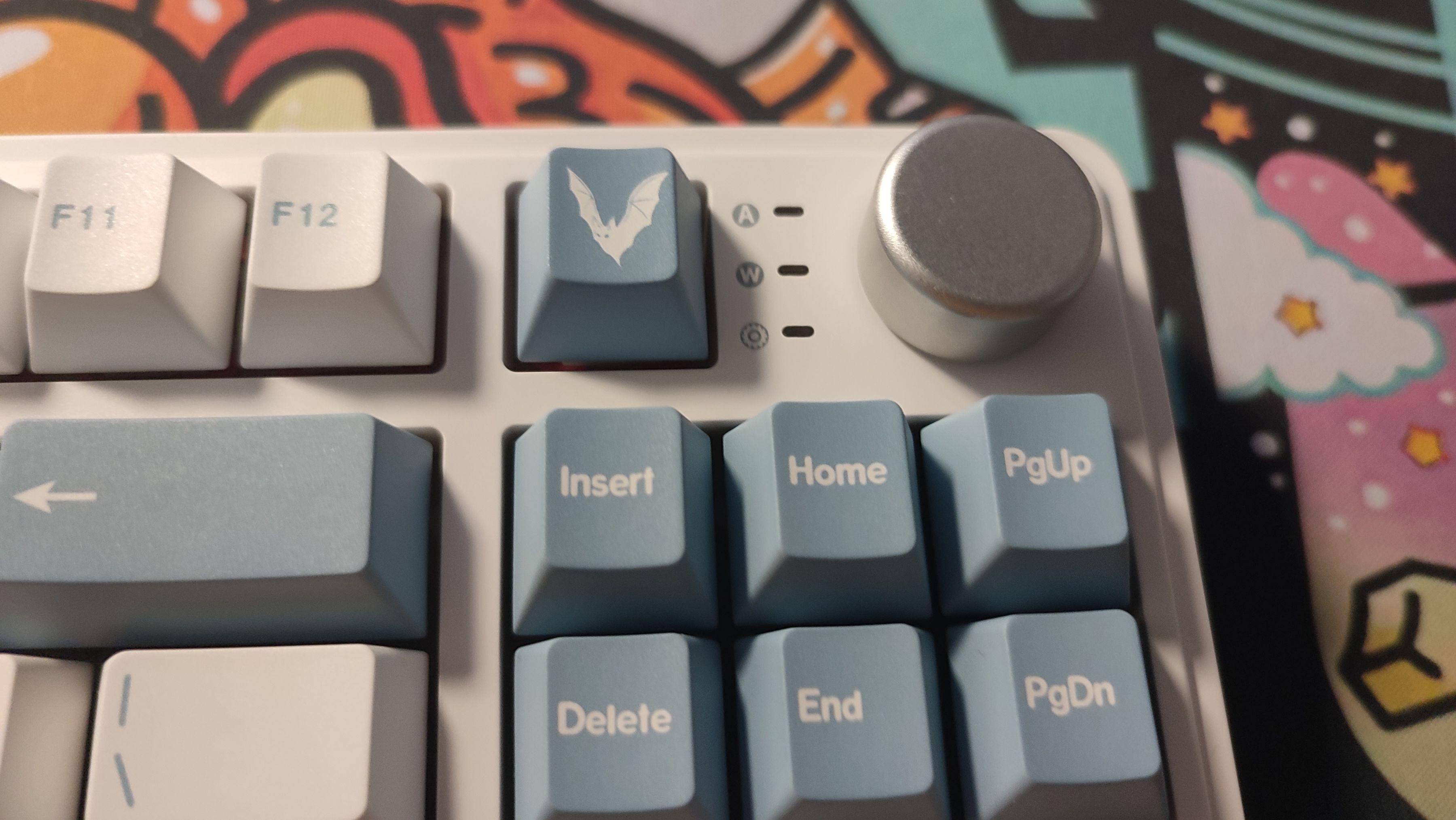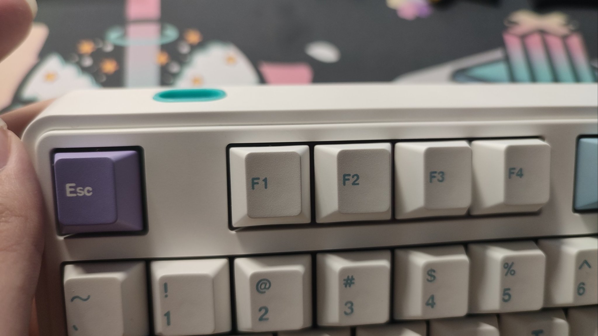 正面可以看到採用的是87%的配列布局,不過不同於常規的87鍵鍵盤的是,右上角的九顆功能鍵變成了七顆,剔除了兩顆相對來說不太常用的按鍵,更換爲指示燈和旋鈕。旋鈕這個設計就看各位喜不喜歡用這個來調節音量了,我個人非常喜歡。