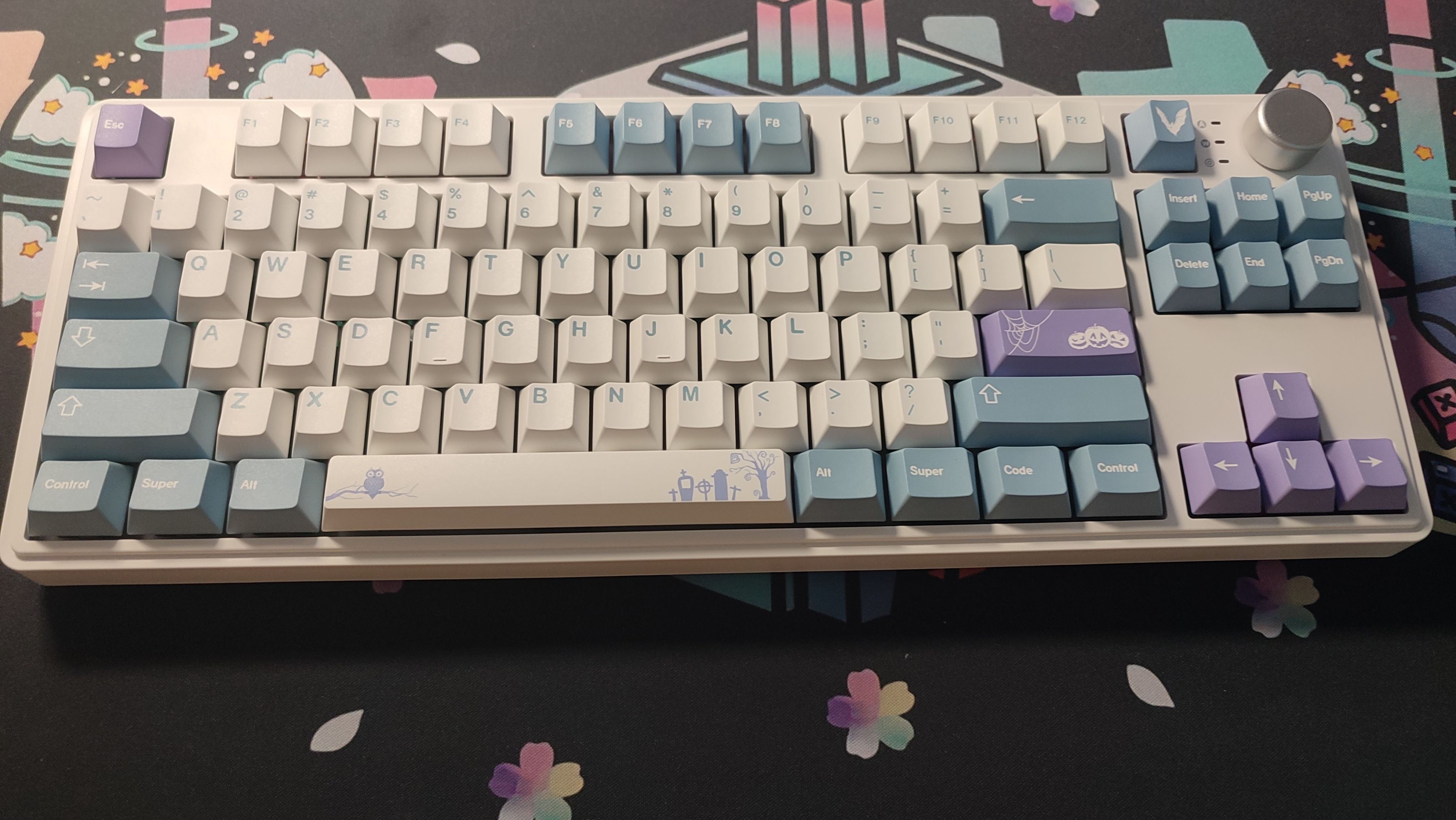 鍵帽我選擇了日當午家的咕靈精瓜,鍵帽採用五面熱昇華工藝製成,原廠高度149鍵大全套,包含階梯caps、7型回車、7u空格、分裂空格等按鍵,有非常多的個性按鍵增補可選。