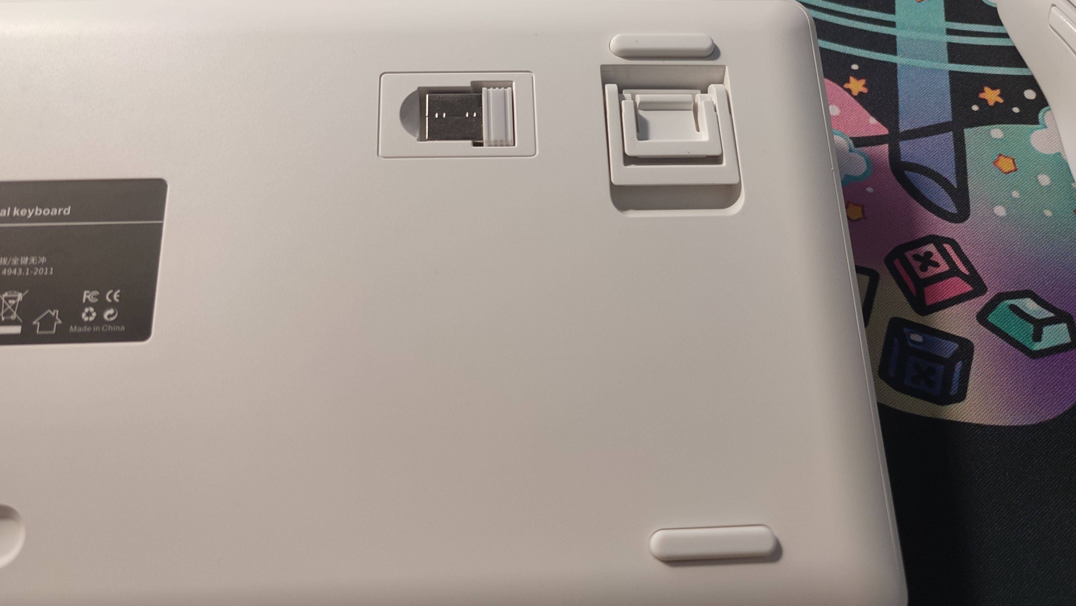 鍵盤四角配有四個防滑腳貼,二段式腳撐上也均配有防滑腳貼,2.4G接收器收納倉的位置在腳撐附近,有磁吸還是十分方便的。
