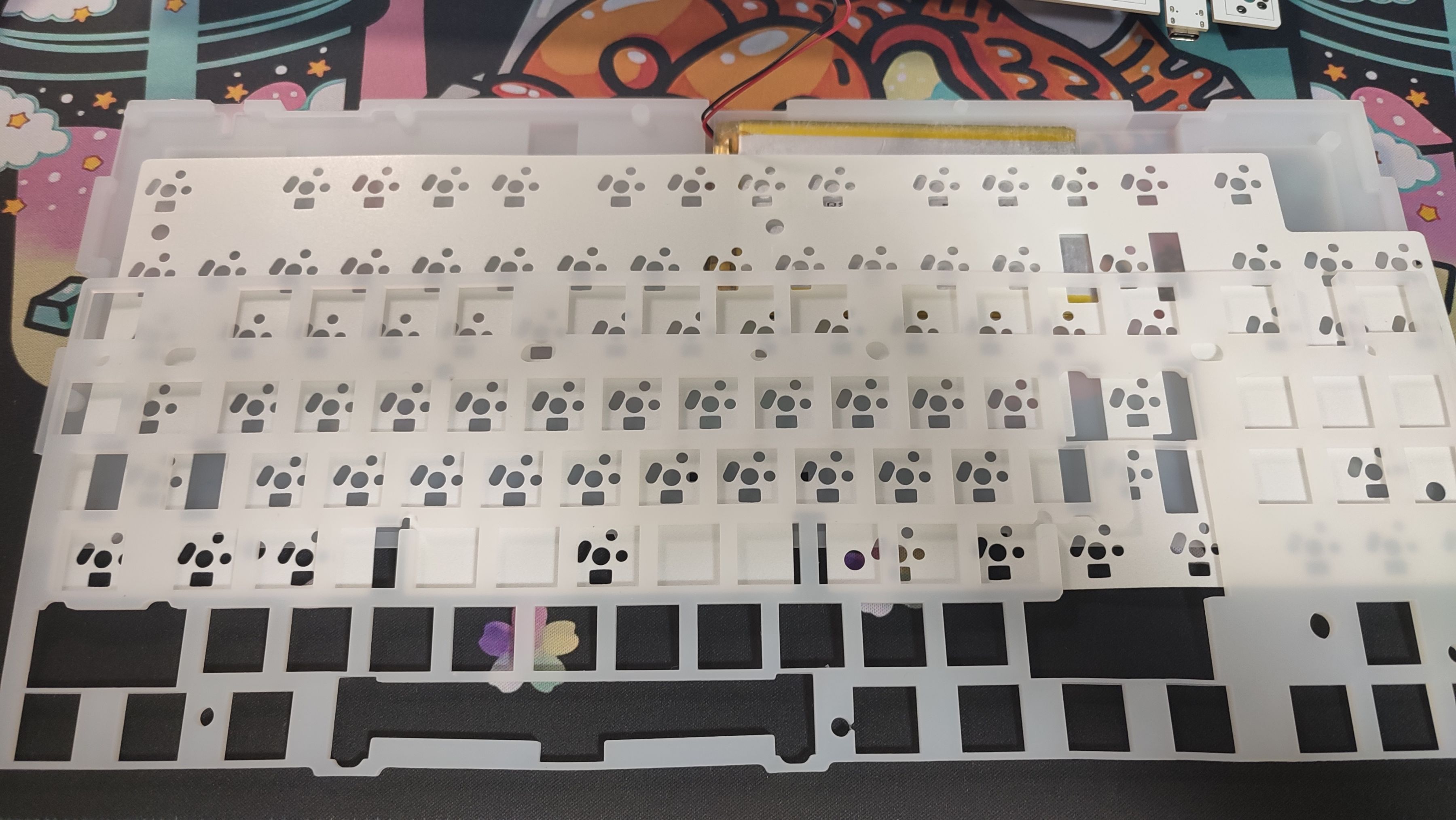 其次是底殼,目前市面上的GASKET爲了減少故障率和返修率,都或多或少加了限位柱,後果就是有限位柱頂着,GASKET結構獨特的“下沉”沒法表現出來,很多人買GASKET結構鍵盤就是爲了這個軟彈手感,但是限位柱的存在讓這個軟彈沒了,所以在看到DK86的這個底殼沒有限位柱的時候非常驚喜,這樣一來GASKET的軟彈手感就得到了保留。