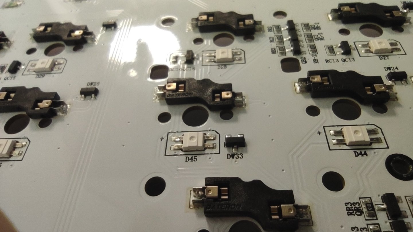 從PCB上可以看到,軸座採用了佳達隆的五腳熱插拔軸座,相較於三腳熱插拔軸座來說,五腳對軸體的兼容性更高;同時整體採用下燈位的設計,配上一個側刻鍵帽立馬就是某音爆款鍵盤