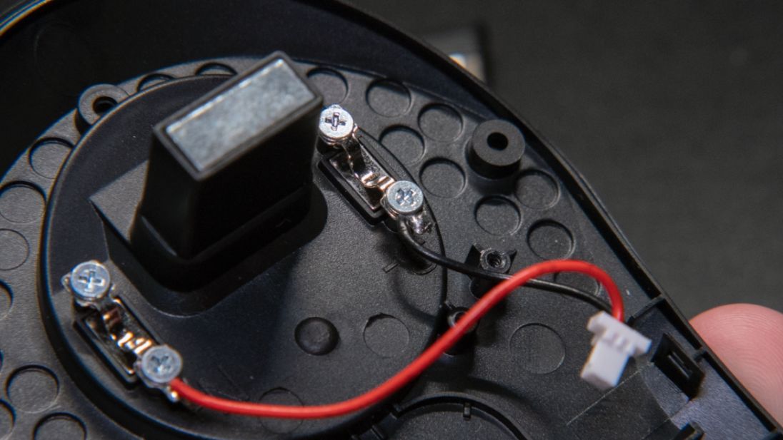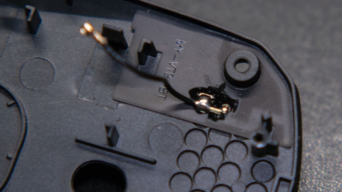 在鼠標左上角還有一根焊到外殼上的同軸信號線,充當鼠標的無線天線使用。