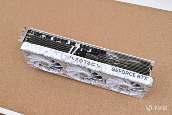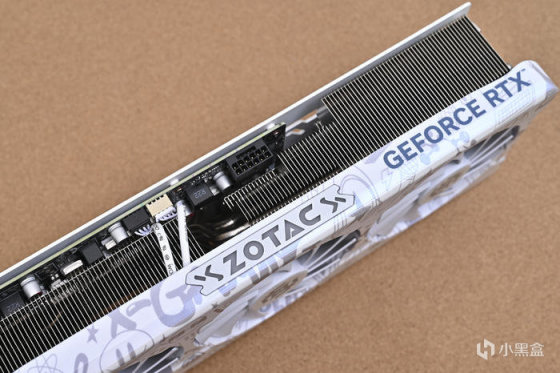 側邊中間的 ZOTAC Logo ,爲鏡面半透明呼吸燈,點亮後會有 ARGB 燈效。上方是供電接口,規格爲 1 x 12VHPWR。右側印有 GEFORCE RTX 字樣。