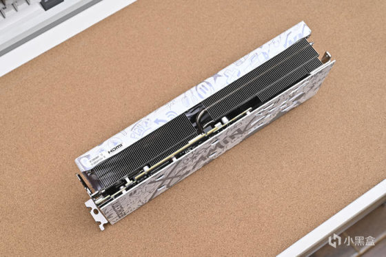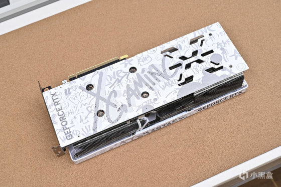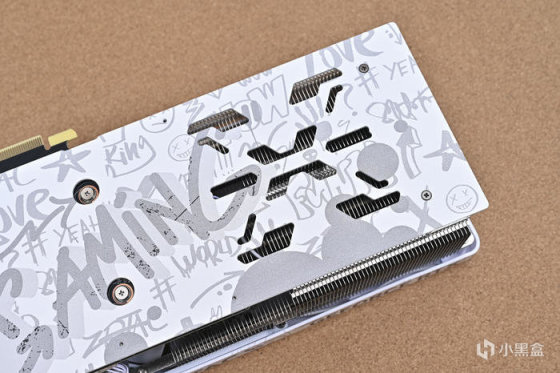 顯卡背面標配金屬背板,採用高強度加固合金材料一體鑄形而成,增加顯卡結構強度,有效保護PCB,提升顯卡靜電防護能力,同時背板尾部做了大面積開孔,方便正面風扇將鰭片熱量從此處快速排出,提高散熱效率。背板上中央還印有 XC GAMING 字樣藝術字。