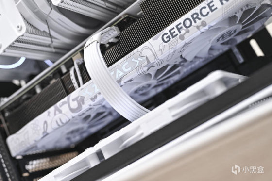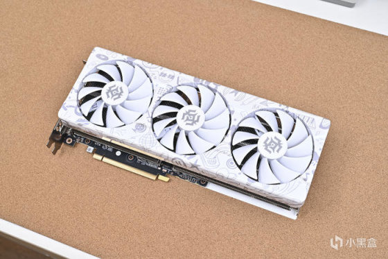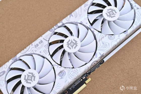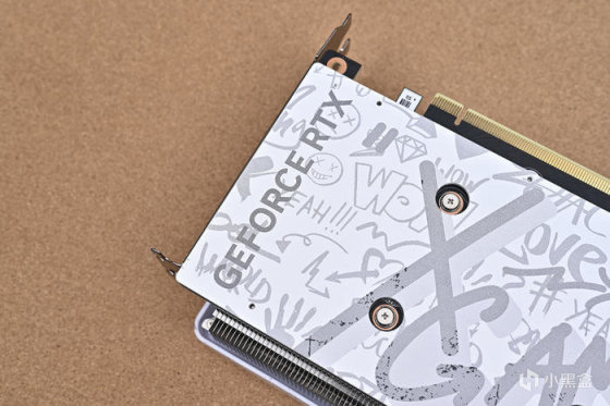 顯卡正面展示。這款顯卡源於歐泊石的設計靈感,歐泊 英文 Opal,意爲集寶石之美於一身,清新淡雅的白色基底色上,採用多重特殊工藝處理,在顯卡外觀上呈現出如同歐泊變彩效應的視覺效果,同時在此基礎上,添加了玩趣十足的塗鴉點綴,活潑靈動,樂趣恒生。正面採用三風扇設計,這款顯卡採用了全新升級的高效冰芯散熱系統,搭載靜音三風扇、大面積冰靜導熱底座、4 根冰脈 2.0 熱管、全覆蓋高密度鍍鎳鰭片,對流穿透散熱設計,能大大提高顯卡散熱效能,釋放核心全部潛能。顯卡整體尺寸爲:302x121x61mm,2.5 槽設計,基於 GeForce RTX 4070 圖形核心設計,配備 S.E.P2.0 供電系統,擁有流處理器 5888 個,顯存 12GB GDDR6X,顯存位寬 192-bit,核心頻率 Boost: 2520MHz,顯存頻率 21Gbps,功耗 200W。