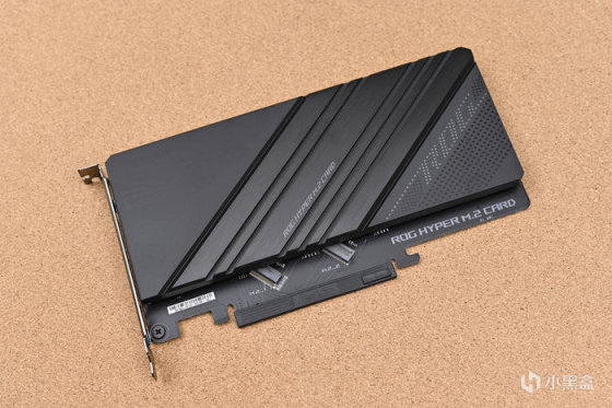 包裝盒內還附贈了一張 ROG HYPER M.2 CARD 拓展卡,單槽位設計,通體由兩塊厚實的鋁合金加工而成,可以提供兩個額外的 M.2 硬盤位,其中 1 個支持 PCIe 5.0。金屬裝甲非常厚實,預貼導熱貼,爲固態硬盤穩定運行提供低溫保障。