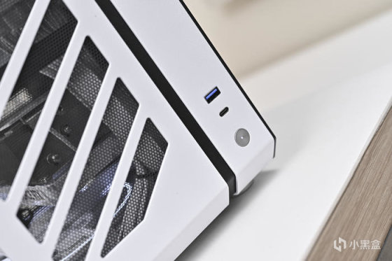 機箱I/O 在前面板右下角,從上到下分別爲:1xUSB3.0 TypeA,1x10G Type-C,1x 全金屬機箱開關,內置白色LED指示燈。