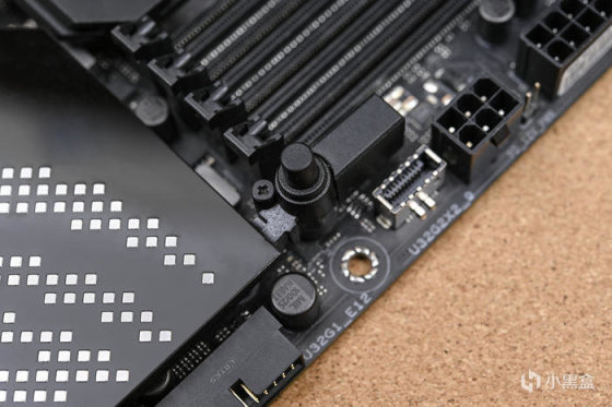 主板配備顯卡快拆按鈕 PCI-E SLOT Q-RELEASE,只需一鍵按下即可快速拆下顯卡,非常方便。旁邊有一個前置 USB 3.2GEN 2X2 20Gbps Type-C 接口,額外的PCI-E 6-PIN連接電源,可使接口最高輸出 60W 充電功率。