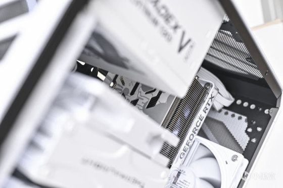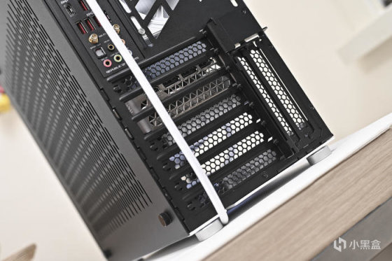 下方爲顯卡接口,右側的雙槽位支持雙槽 45mm 厚度內顯卡豎裝。