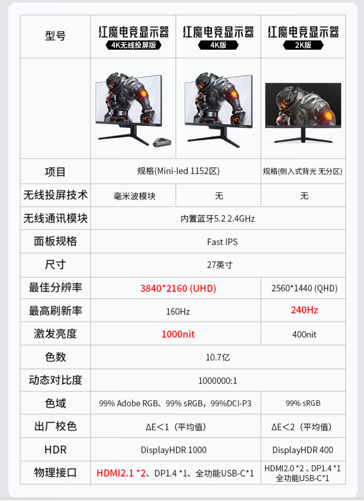 當然,如果預算充足的話,更建議入手紅魔電競顯示器4K版,4K分辨率+160Hz高刷+MiniLED背光面板的顯示效果更是目前的頂流水平,頂配版本甚至還支持毫米波無線投屏。