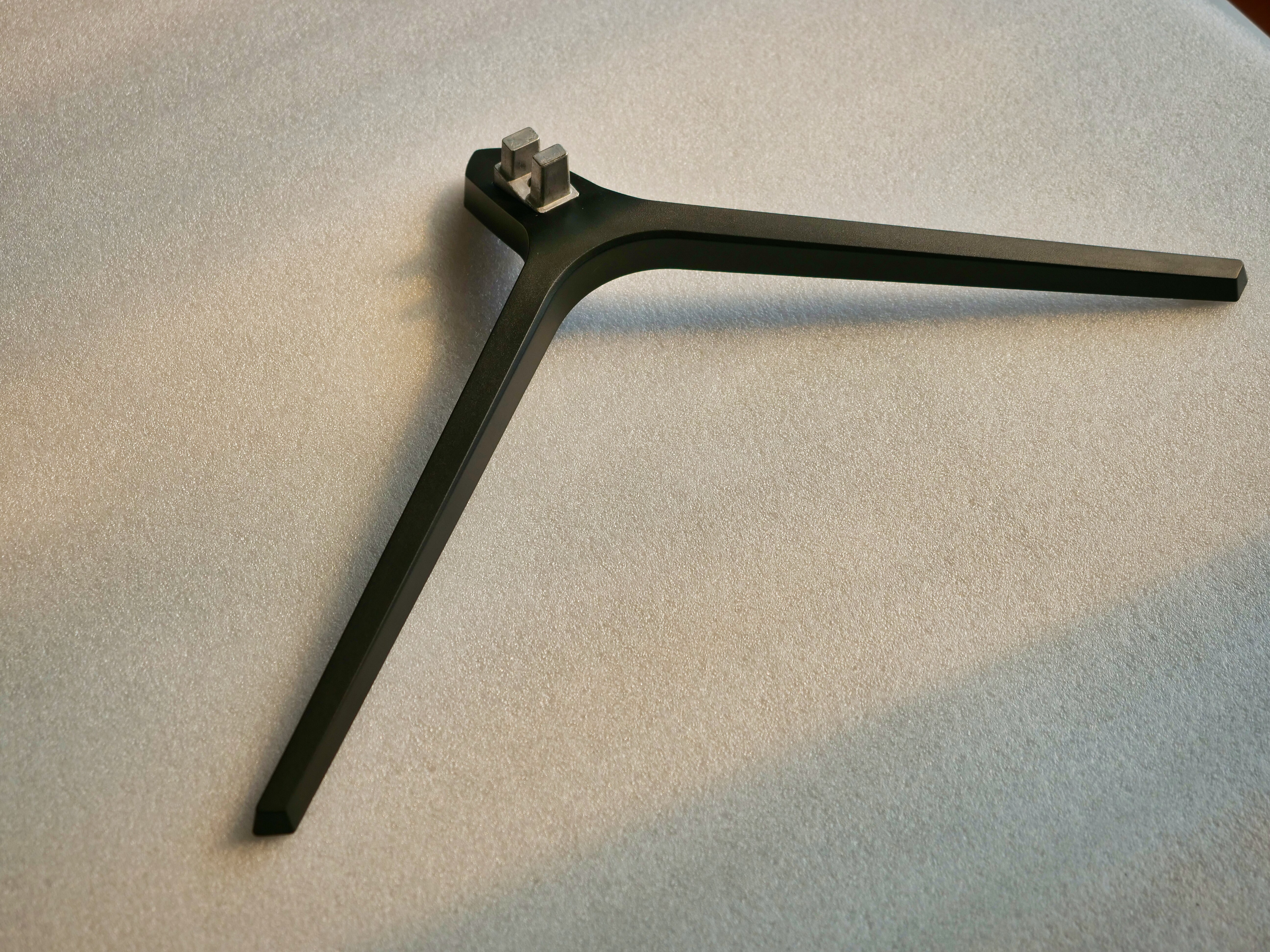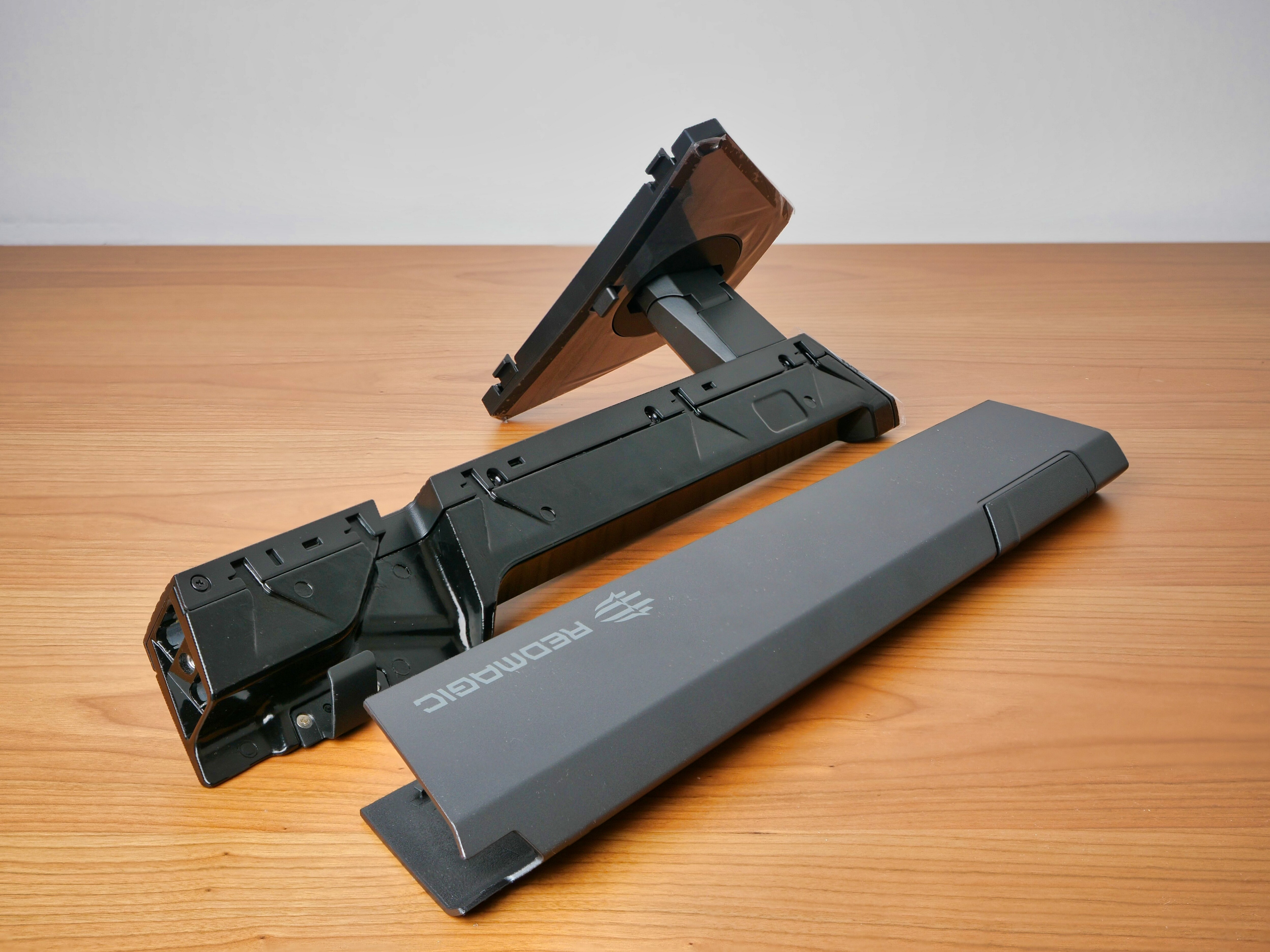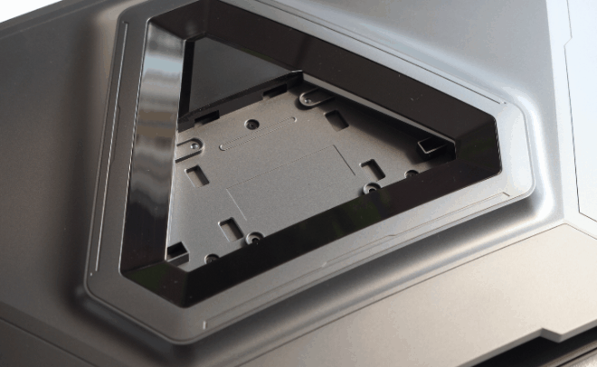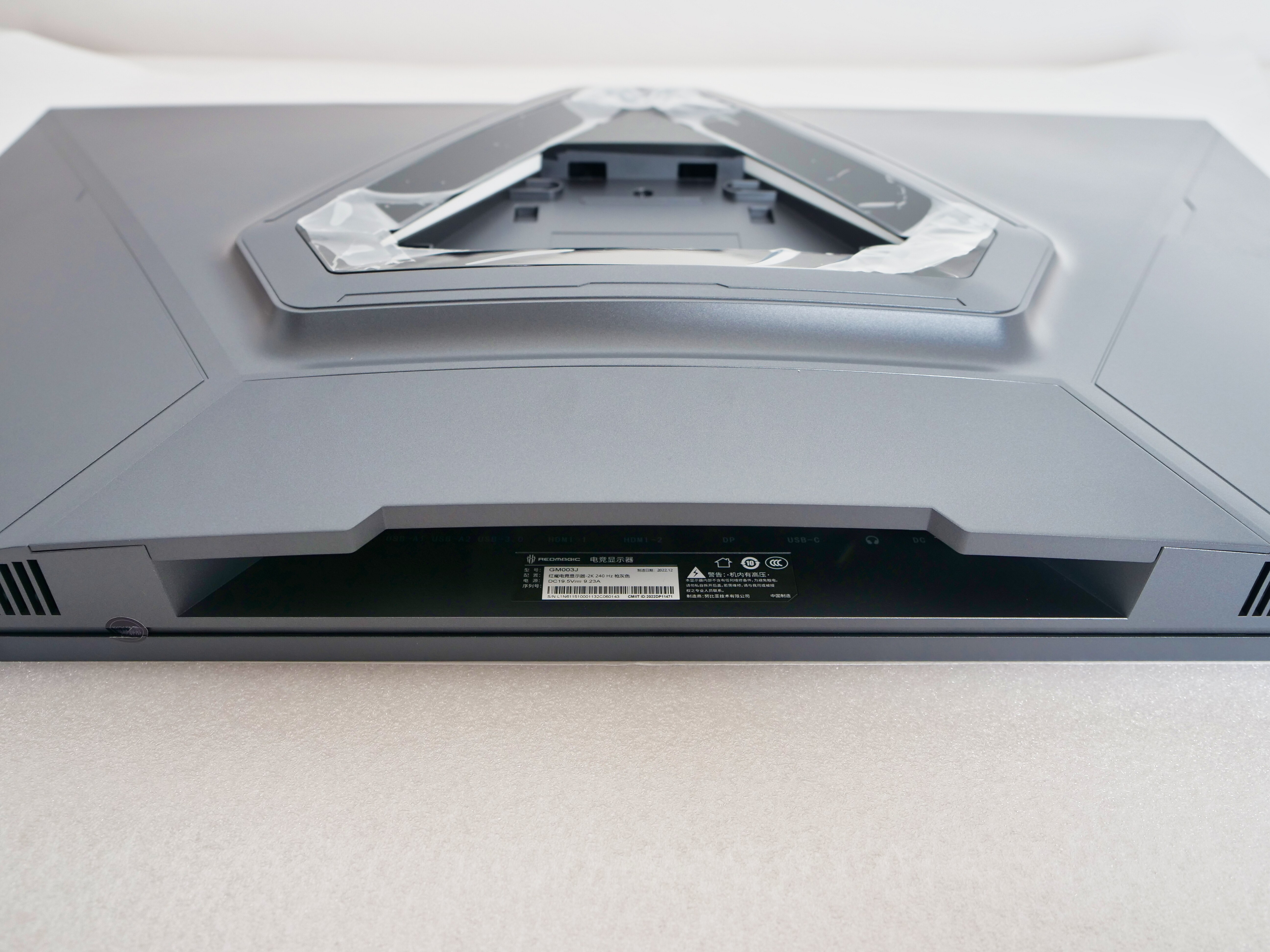 ▼顯示器的支架用手顛着相當沉重,同樣用料非常紮實。整體大量使用了梯形的凌厲線條設計,搭配金屬灰色的塗裝,很有一種科幻和酷炫的風格,與電競顯示器本身的定位非常契合。同時,支架與顯示器本體連接的部分並未採用最常見、普通的正方形,而是類似三角造型的異型設計,十分別致。