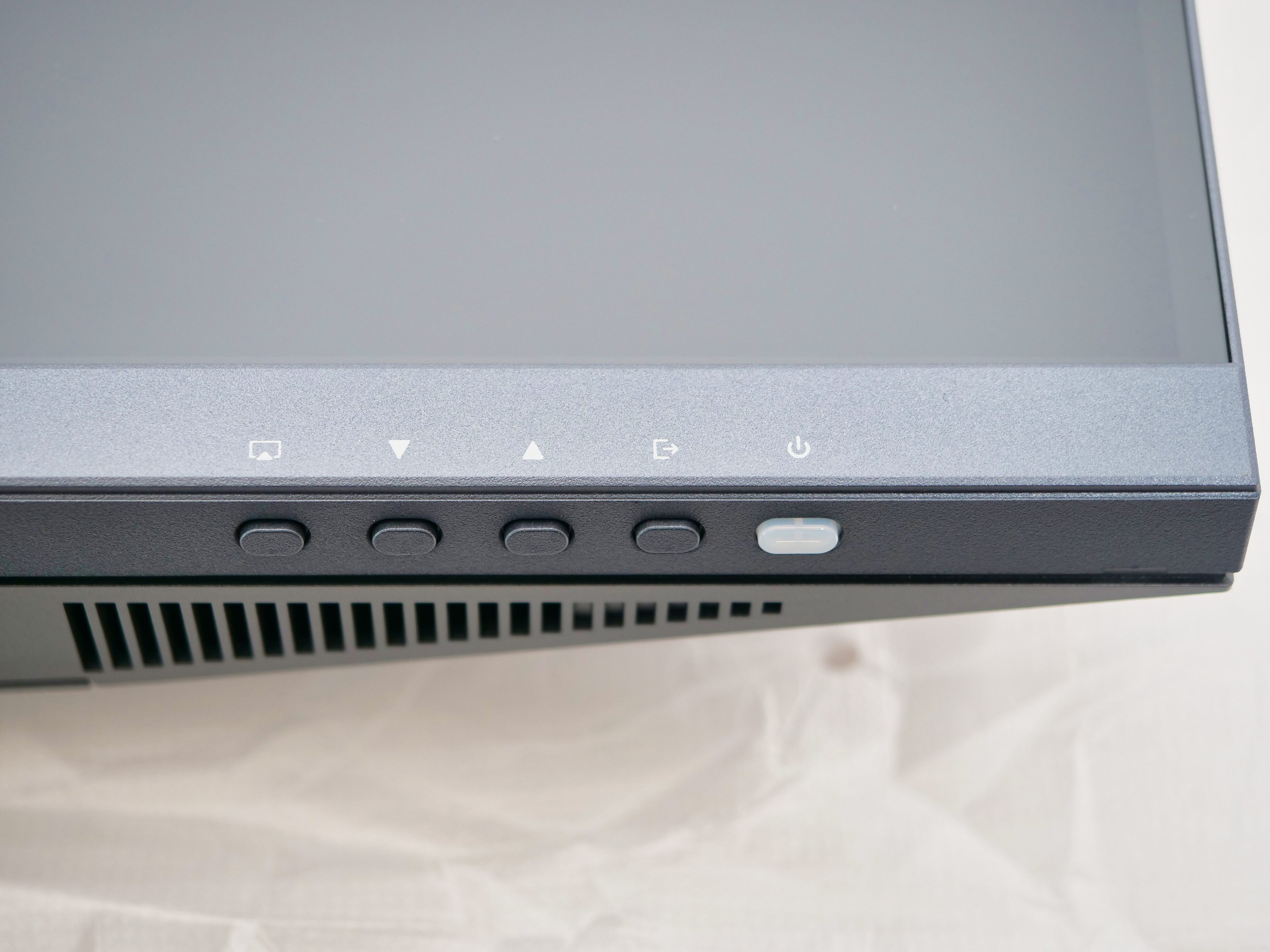 ▼顯示器正面爲三邊極窄邊框,OSD菜單鍵使用了按鈕結構,實測手感較硬,不過穩定很好,不鬆垮,不易晃動。