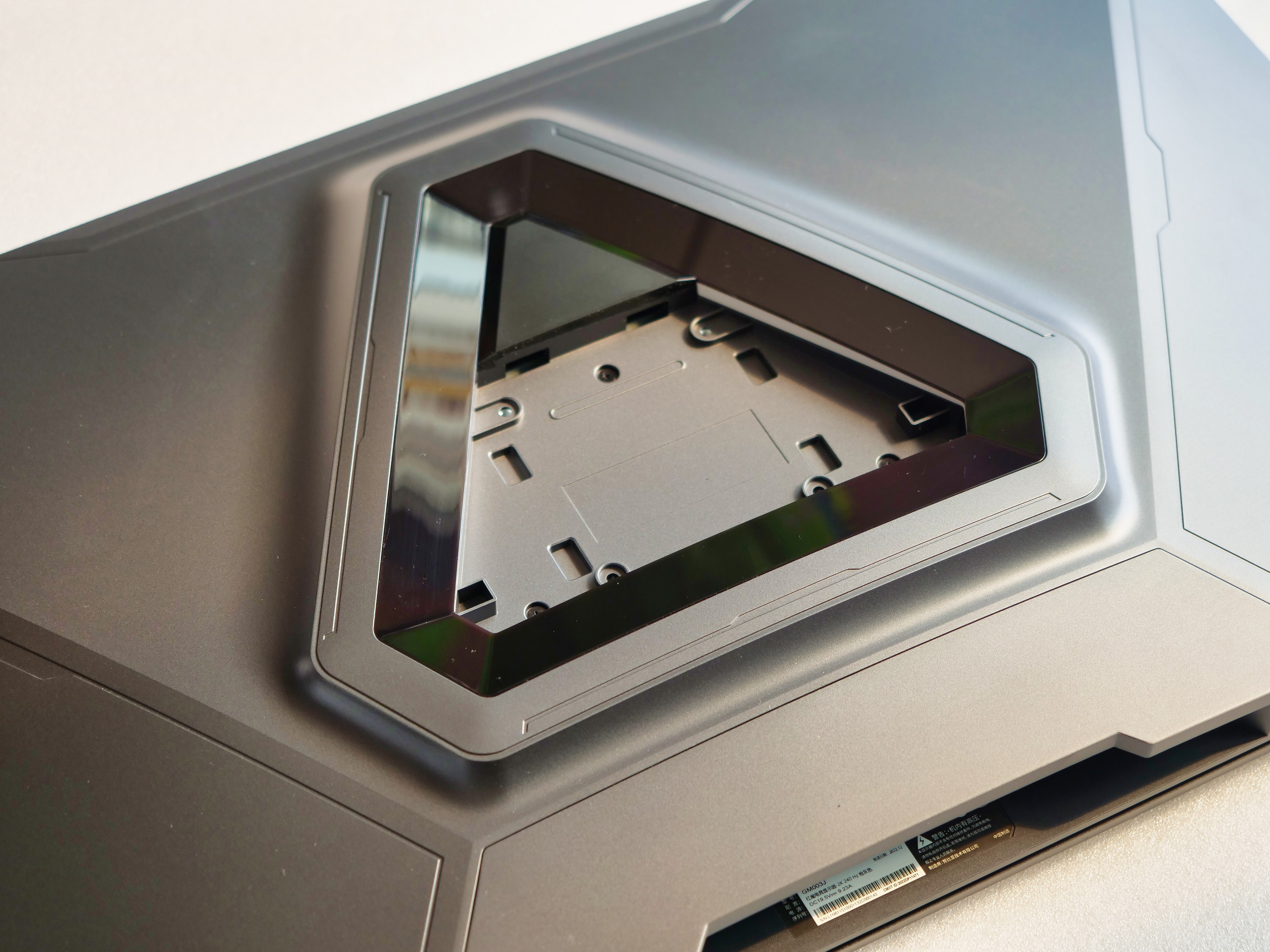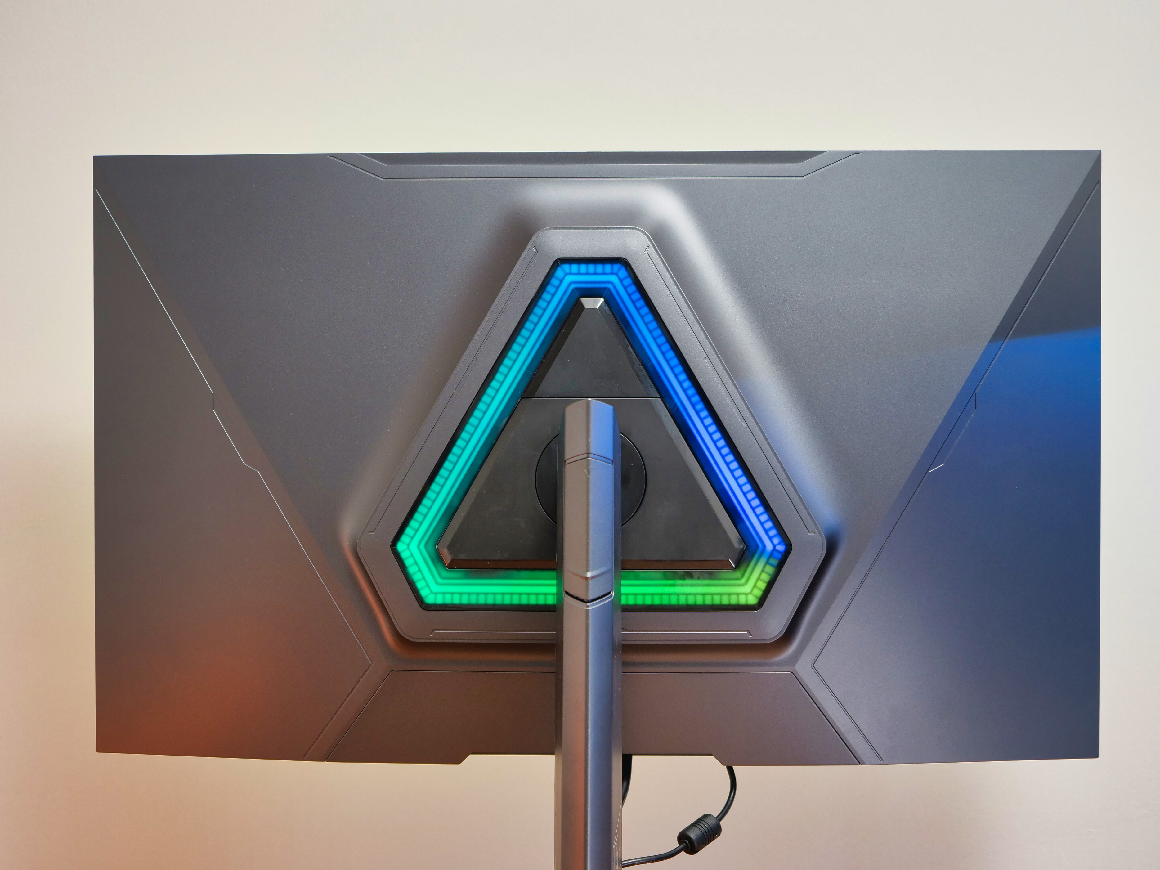 ▼整臺顯示器都爲金屬灰配色,背部被線條切割成了四塊區域,在曲面及線條棱角搭配之下,很有科技感和電競氛圍。官方把背部中央的三角形區域稱之爲“能源之心”,裝有一圈RGB氛圍燈,夜晚看時非常高級酷炫。
