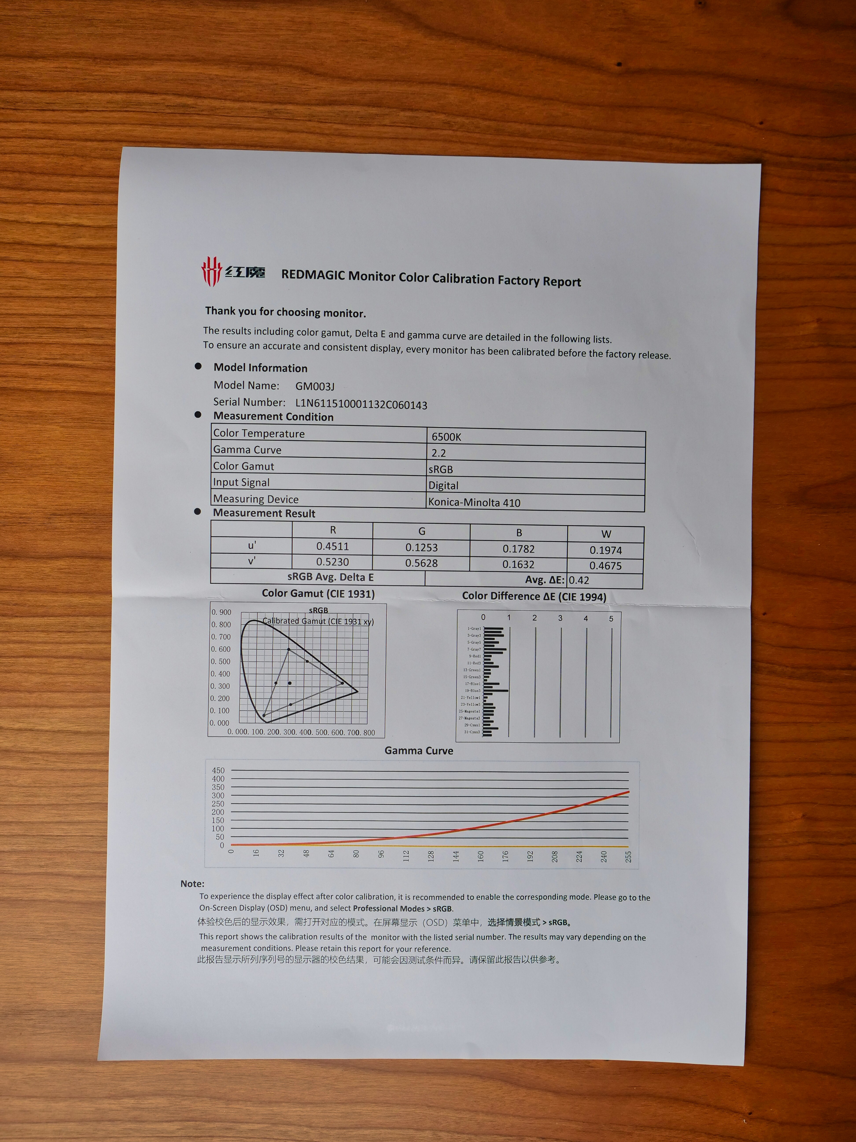 ▼廠商對於色彩方面的重視程度,從這臺顯示器隨機自帶的出廠校色報告裏就能看出來,目前普通的顯示器沒有幾臺會做出廠校色的吧?