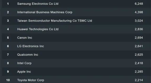 光是2022年华为研发投入就达到1,615亿人民币,占全年收入的25.1%,十年累计投入的研发费用超过9,773亿人民币。下图是美国商业专利数据库(IFI Claims)发布的2022年度美国专利授权排行榜。