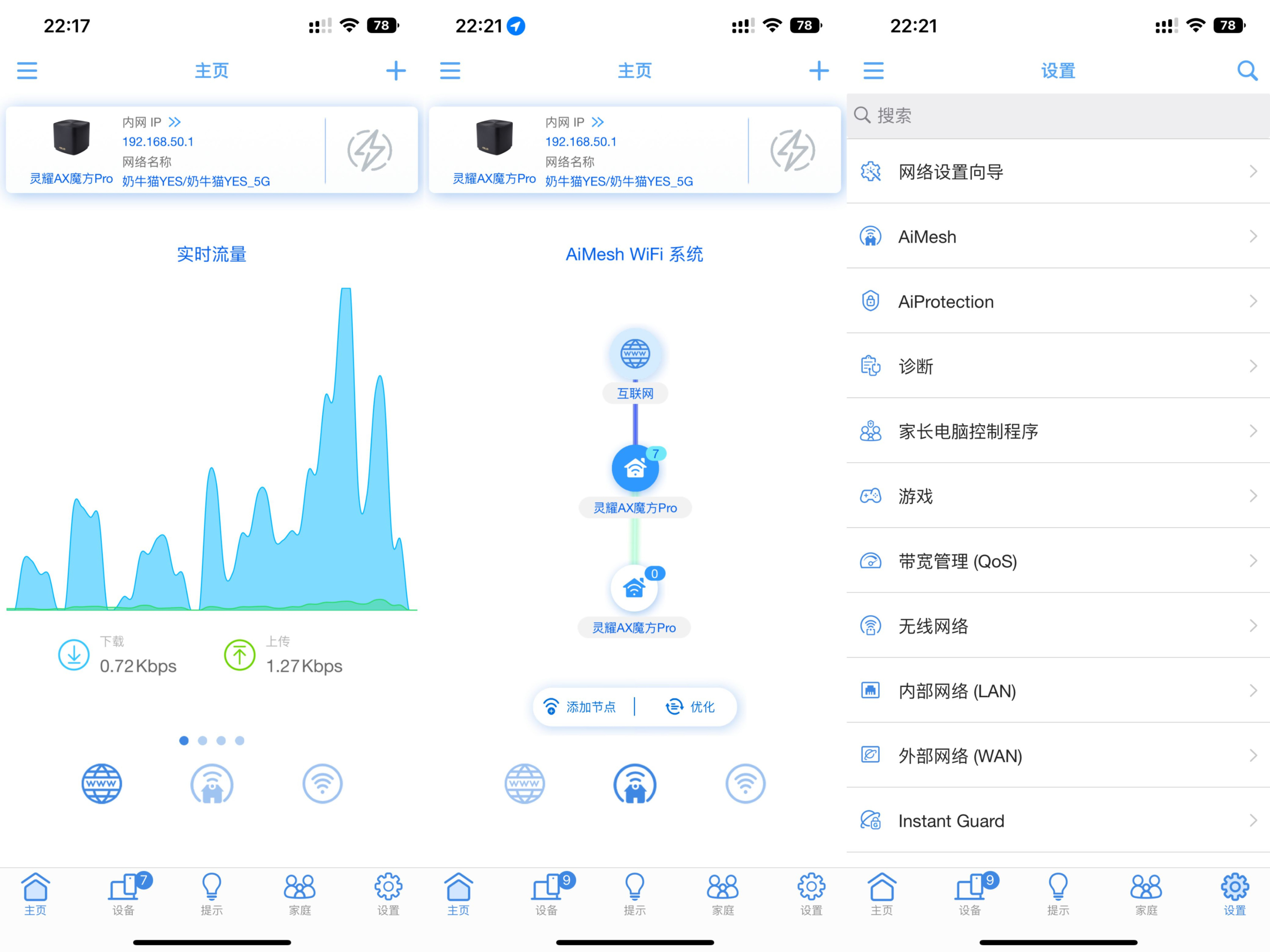 随着我从上海搬家回重庆,屋子终于到了一百多平,之前在上海有个TP-LINK的WiFi6路由器覆盖上海的小户型毫无压力,但是到了这边的大户型就有些吃力,我于是在这时候把眼光瞄向了华硕的Mesh路由器,华硕毕竟是路由器中的一哥!口碑稳得一批,我最后选择了华硕灵耀AX魔方Pro,它应该是属于入门级的全能选手。覆盖广,信号好,颜值高,价格也能打!