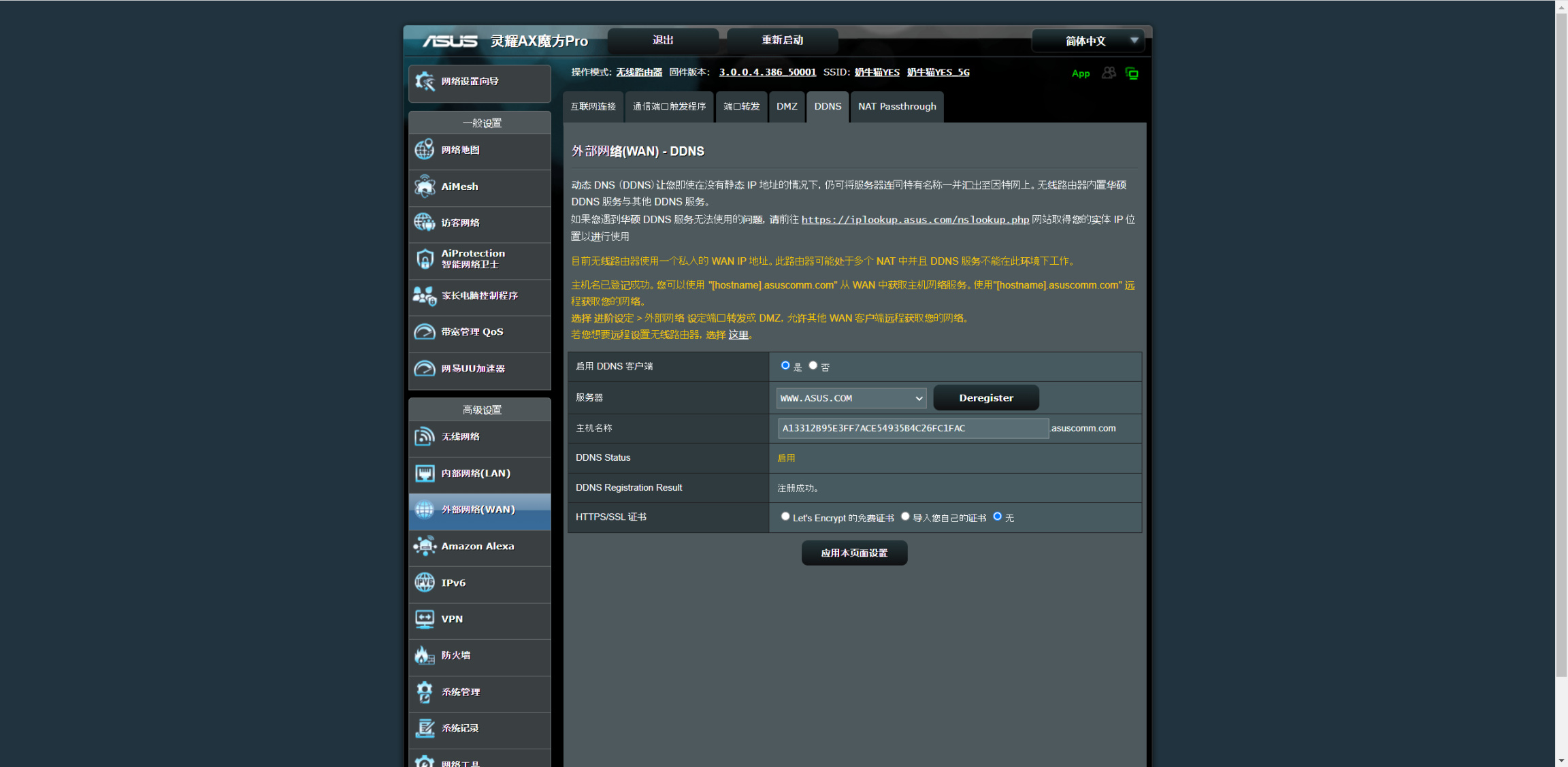 华硕灵耀AX魔方Pro还提供了DDNS服务,华硕有诸多DDNS服务提供商,DDNS就是将用户的动态 IP 地址映射到一个固定的域名解析服务上,用户每次连接网络的时候客户端程序就会通过信息传递把该主机的动态 IP 地址传送给位于服务商主机上的服务器程序,服务器程序负责提供 DNS 服务并实现动态域名解析,极其方便。