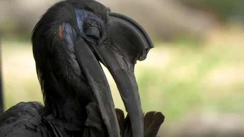 阿比西尼亚地犀鸟有一个又长又弯曲的强力喙,又黑又长。顶部有一个短的开放式黑色“盔甲”,雌性相似但较小。长着长长的睫毛,可以保护眼睛免受伤害。
