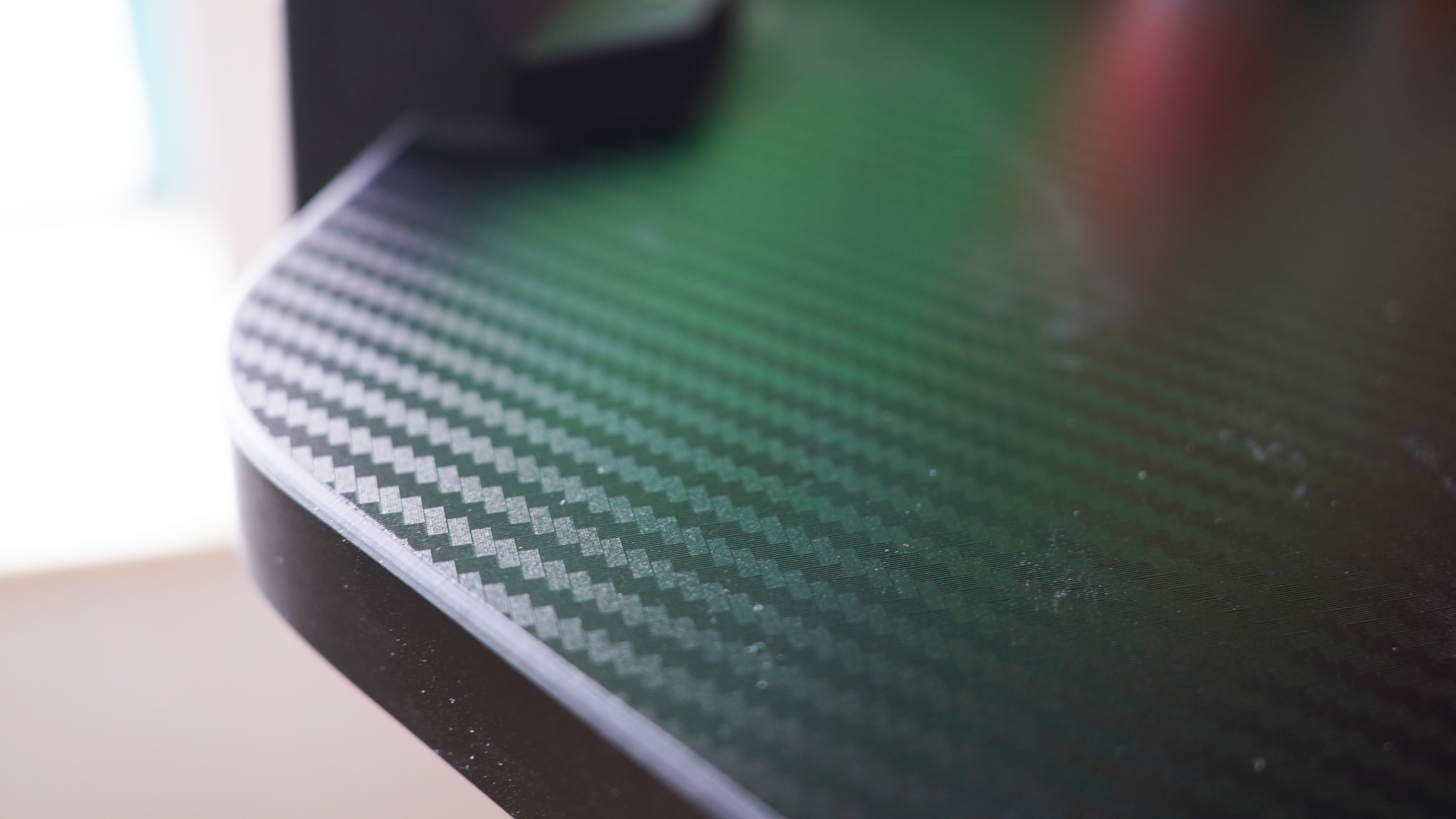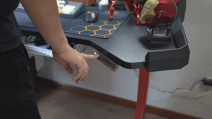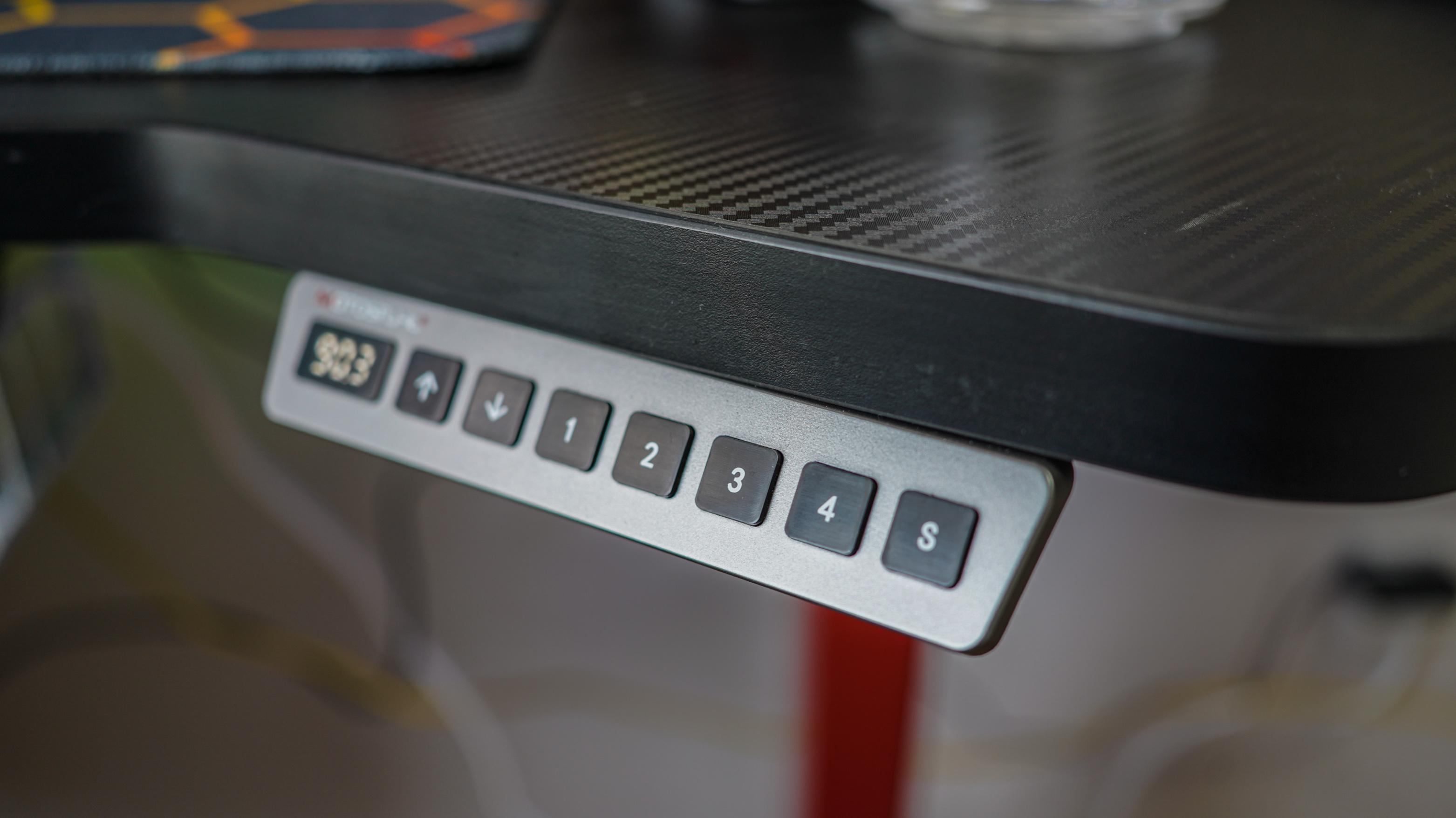 雖然只是單電機結構,但細節方面設計的比較好,升降高度支持71-116cm,190的身高站立使用完美適配,一共支持4擋高度記憶,桌面則符合目前最嚴格的甲醛標準(釋放量≤0.025mg/m”的ENF級),同時表面也做了碳纖維風格的處理。