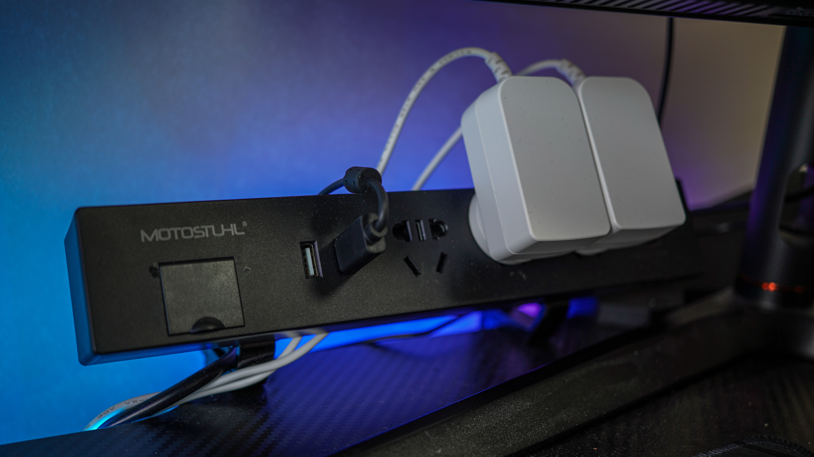 桌面排插是摩伽電競桌自帶的,板載USB接口不是快充,給音響這類設備供電還是可以的。
