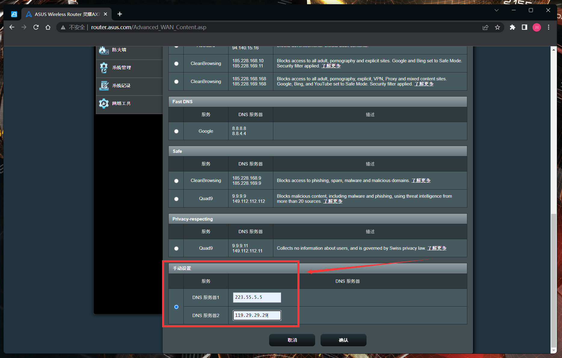 下拉到最下面的手動配置,兩個服務器地址分別填寫阿里和騰訊的DNS地址: