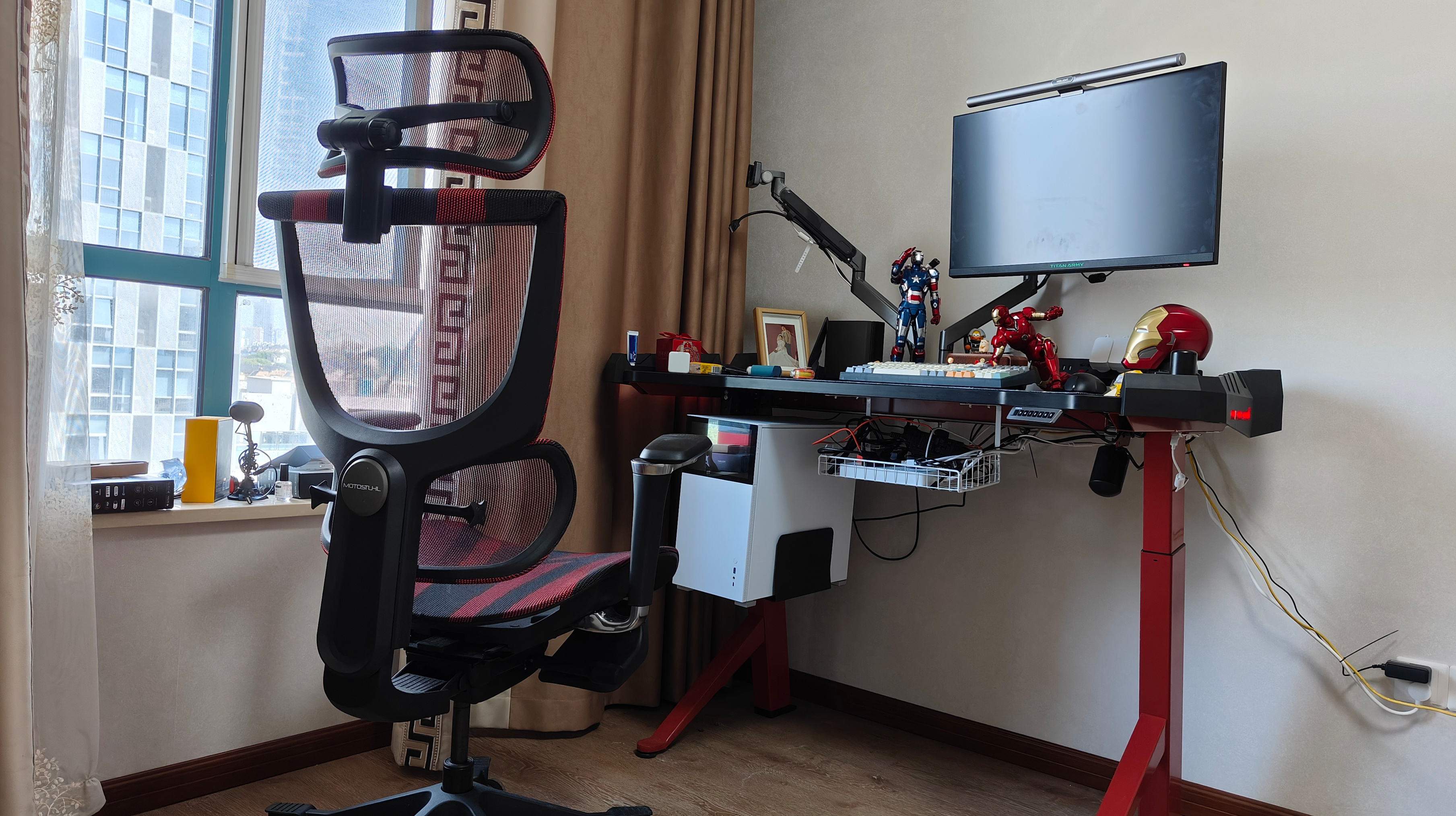 考慮到和我一樣有久坐工作的需求,這次改造也注重了實用性,可站立輸入的升降桌外加人體工學椅全部安排上了,特別是集成了各種小配件和收納位的升降桌,後期折騰會很方便。