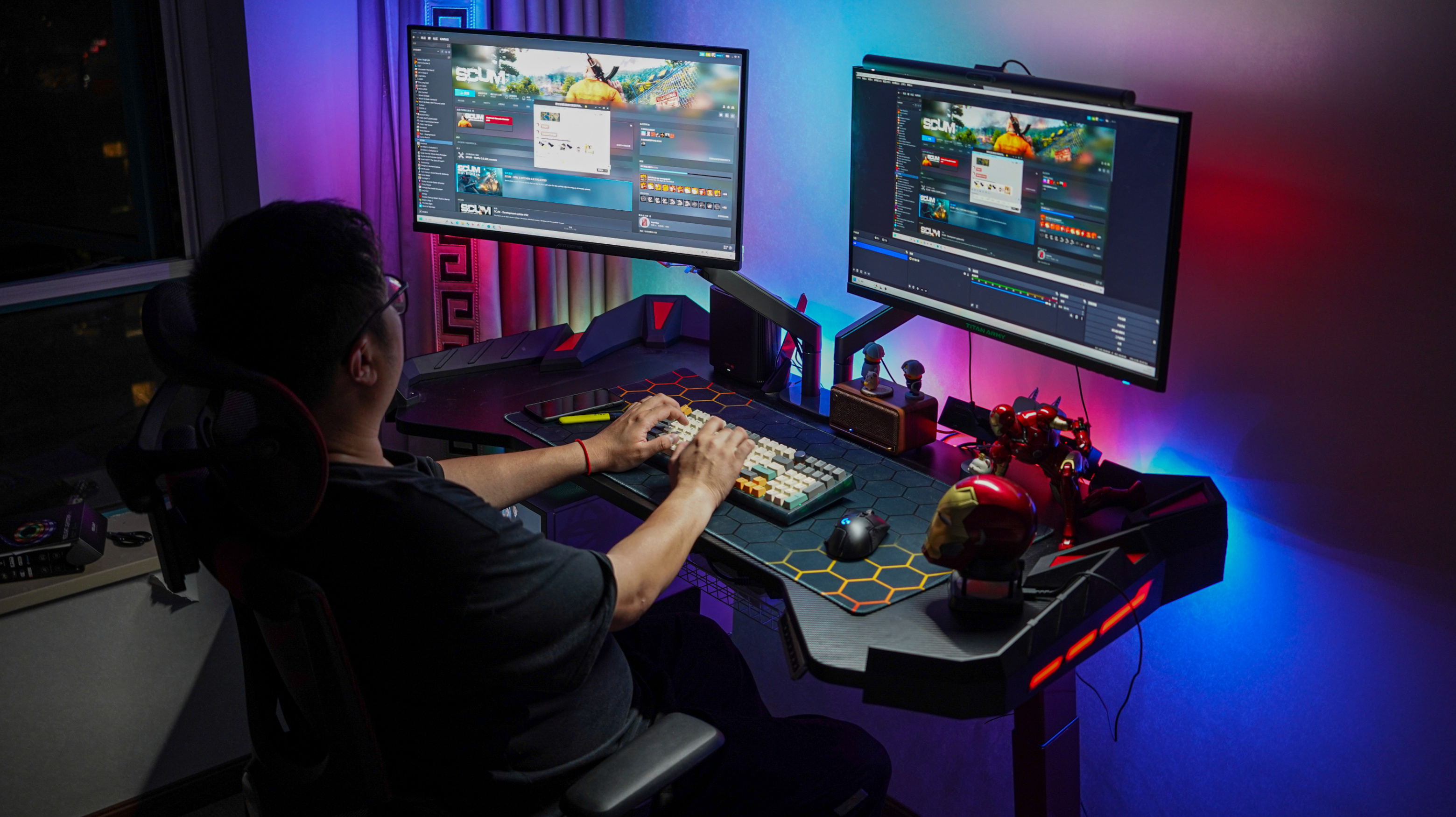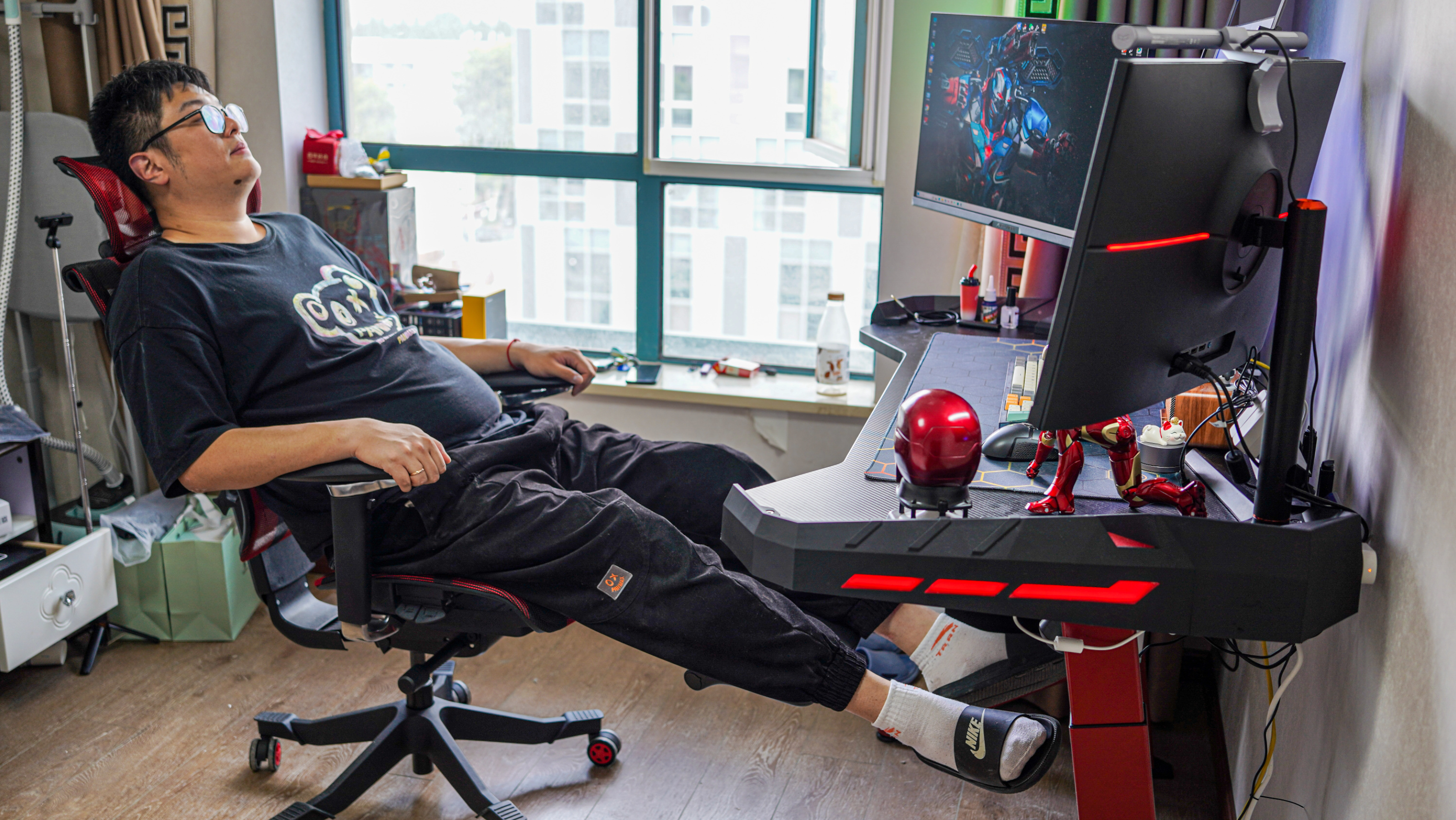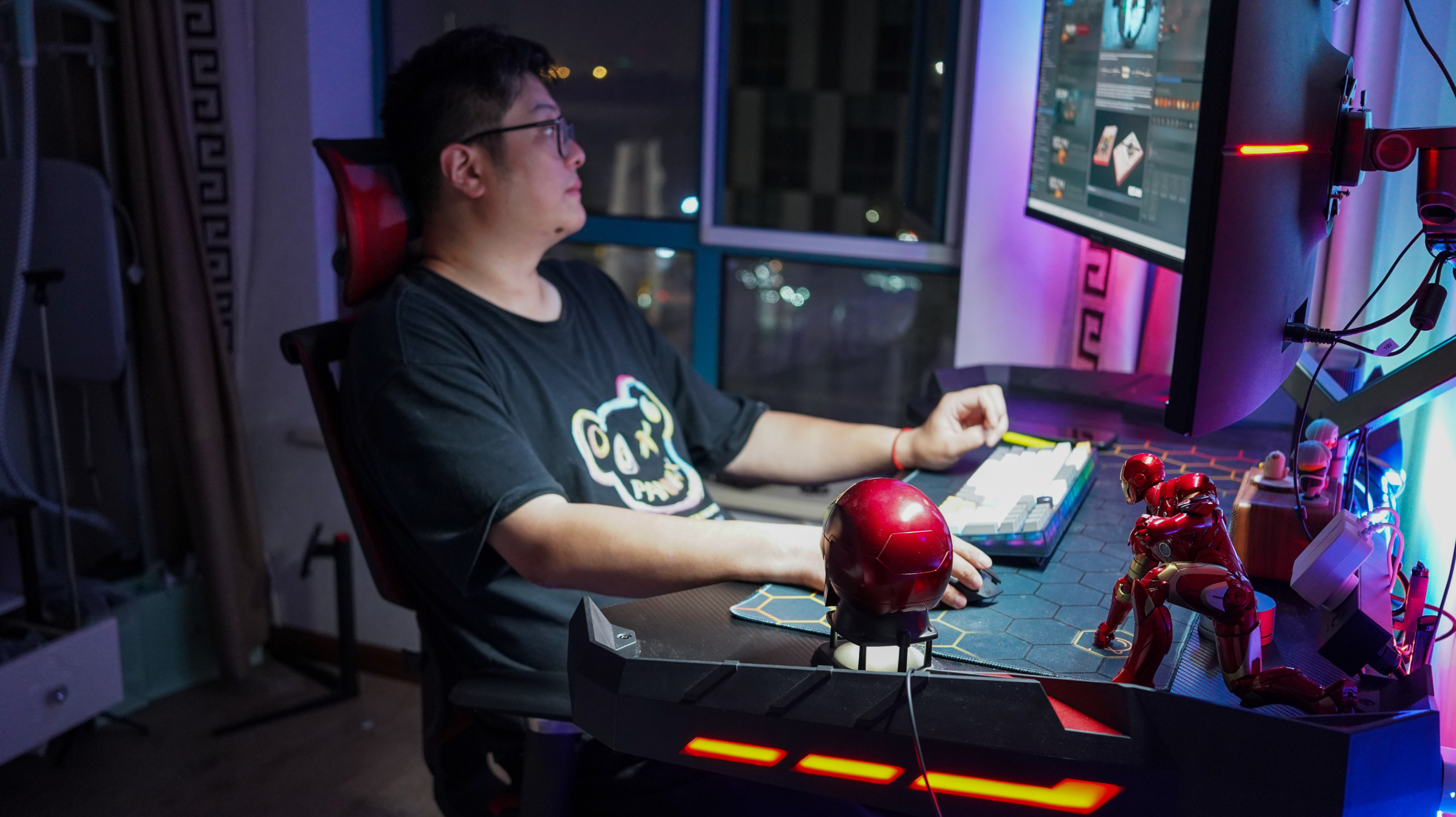 改造後的房間如下圖所示,從原來的居家風格改成了電競風格,反正他也不差錢,幾乎所有配件都奔着花裏胡哨去的,所以花了蠻多預算,不過顏值確實也很高,夜間的燈效拉滿。