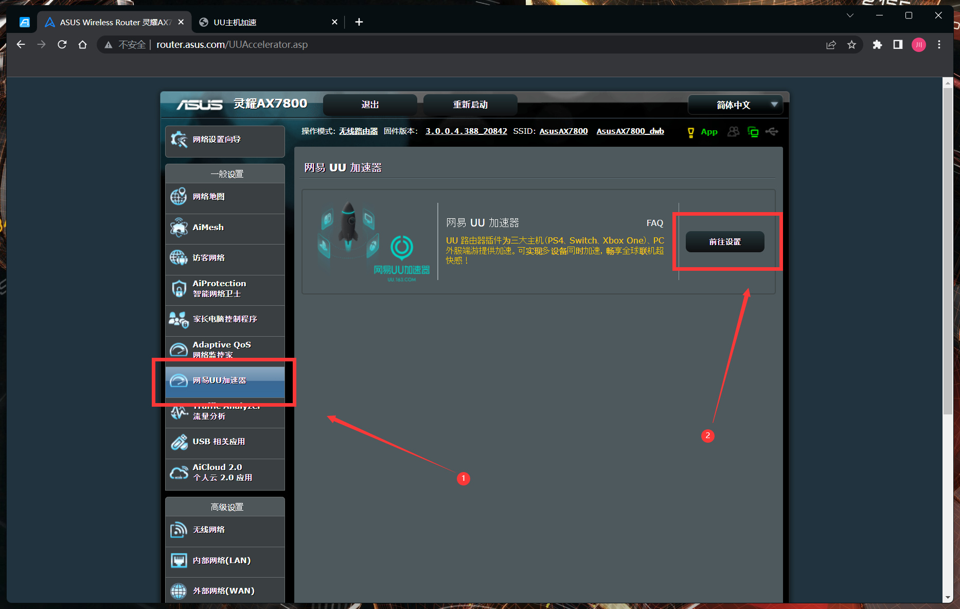 進入UU加速的配置後臺後登陸一下,選擇需要加速的設備就行,手機電腦都可以,用華碩手機App也能快速開關,至此路由器相關配置完成。