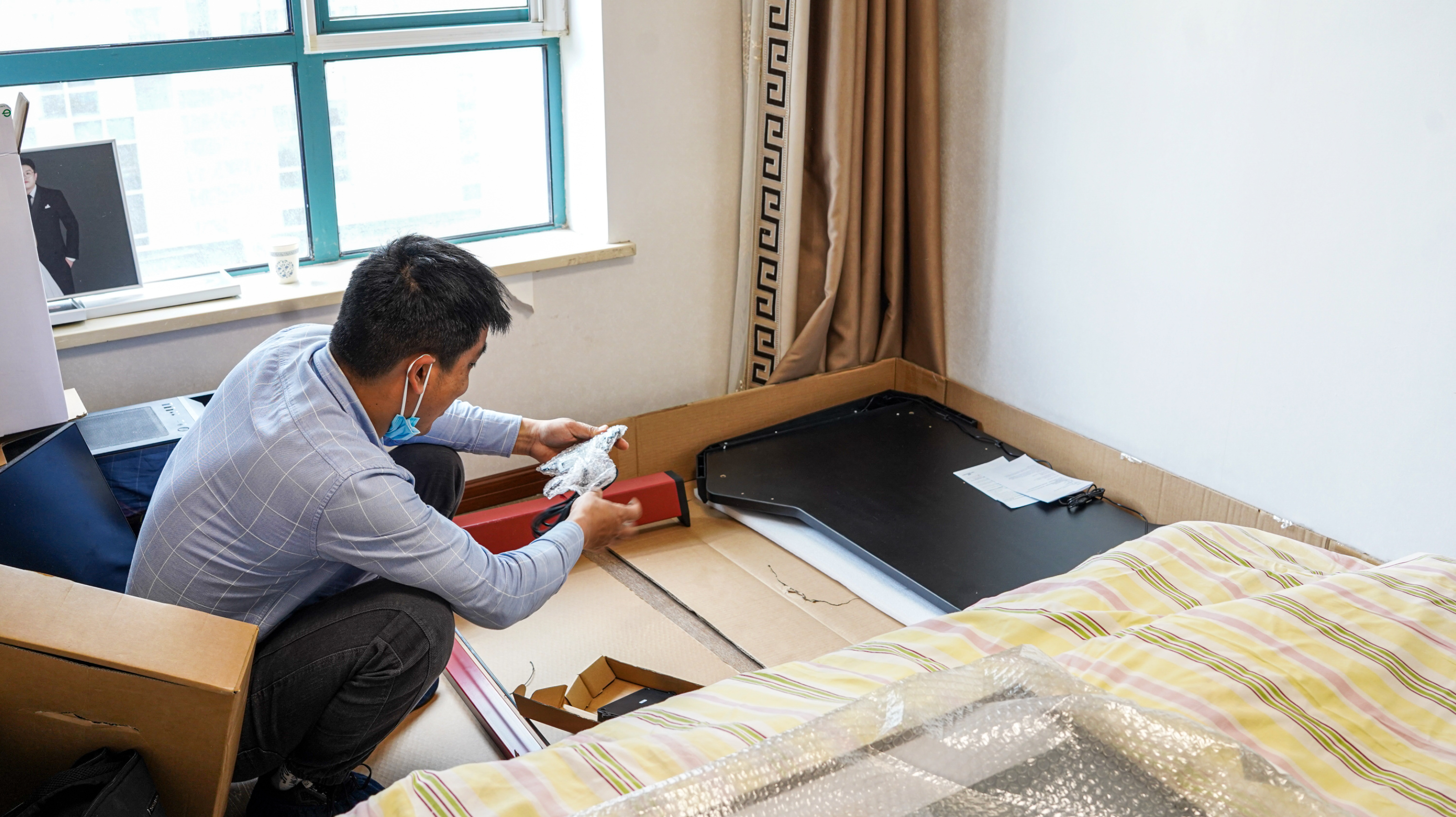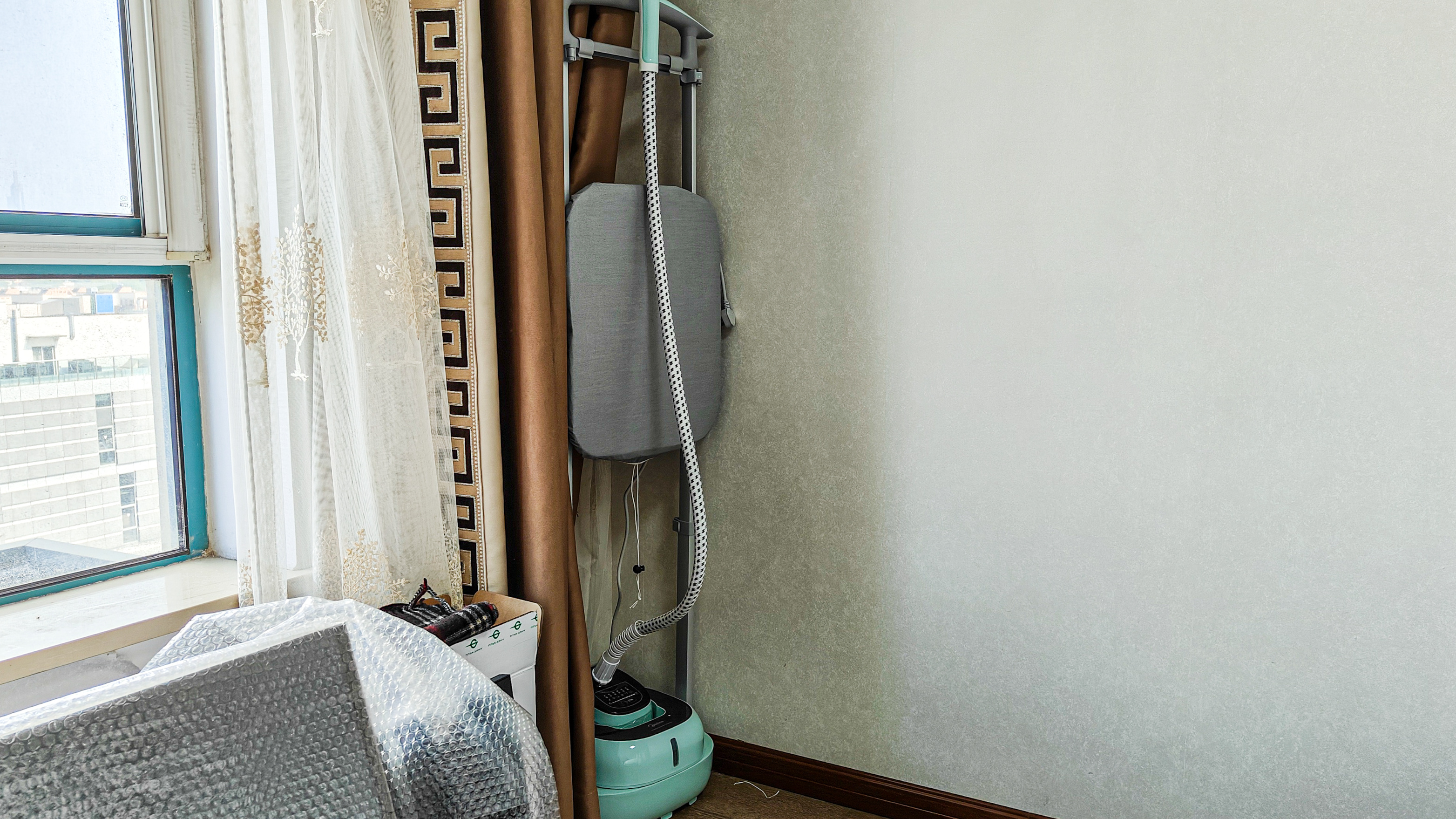 定的放置區域的左手邊就是大的落地窗,白天的整體採光比之前房間好上很多,可惜的是可用長度只有兩米不到的地方,正常使用沒啥問題,就是和牀之間的距離比較小,打算分割臥室當工作區域的朋友注意桌面別買太大,選擇1.2到1.4米的桌子會更合適一些。
