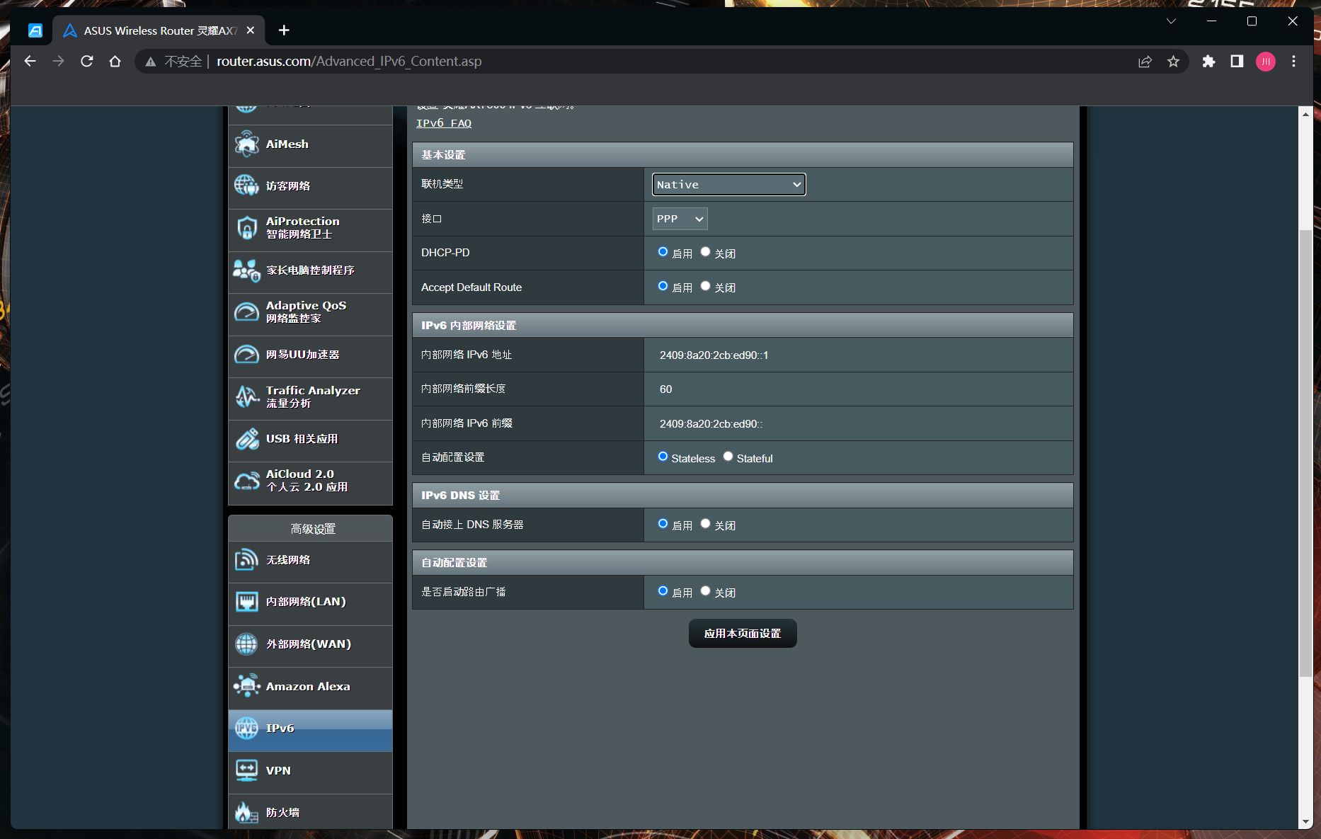第三是IPv6,目前IPv6的普及度已經非常高了,大部分主流應用都支持雙棧且優先走IPv6,點擊IPv6確認開啓就可以,該頁面其他配置不用動,正常自動獲取就好。