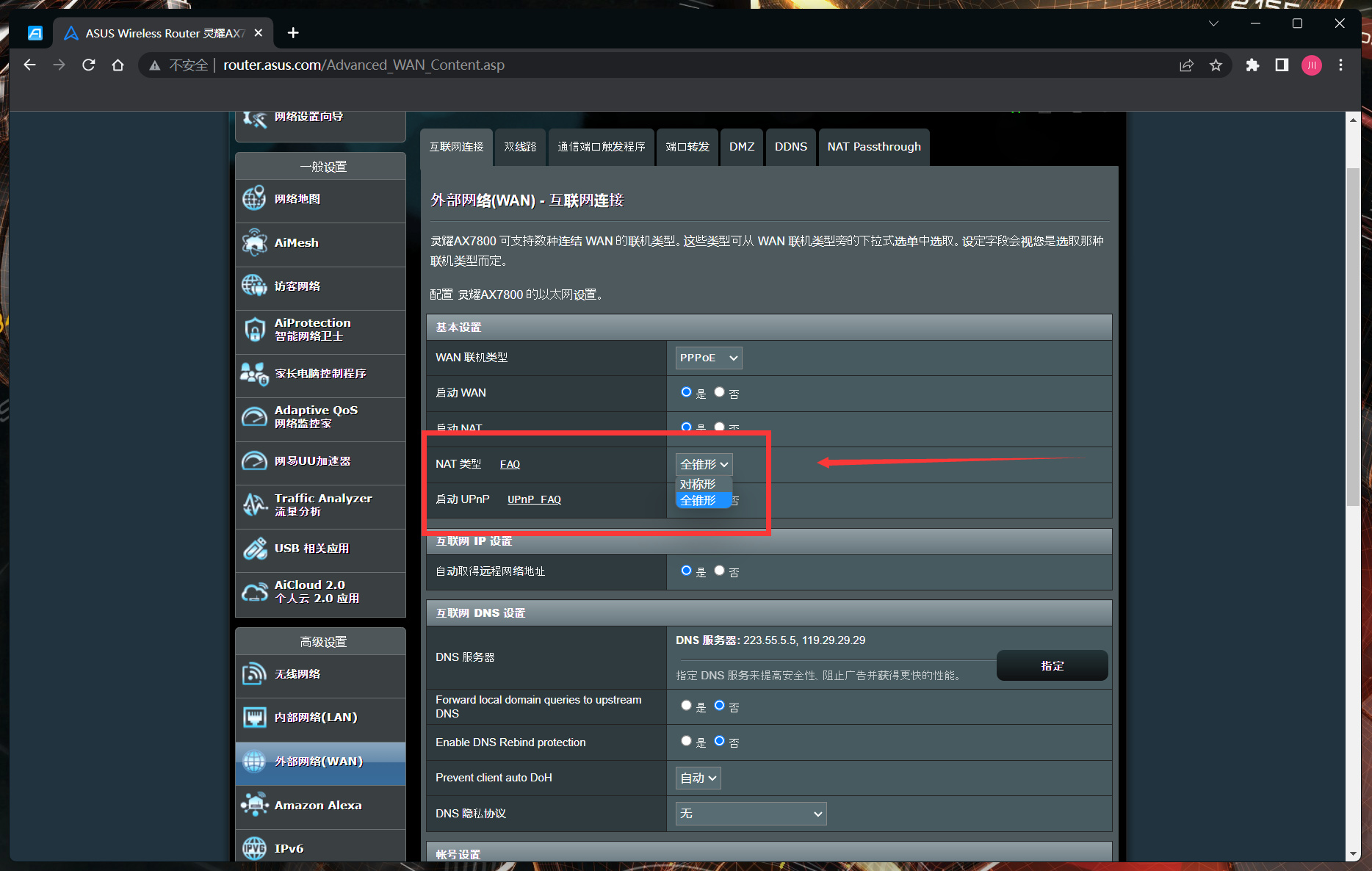 首先是NAT類型,進入外部網絡中的互聯網連接可以看到NAT類型默認是對稱型,也就是最高防火牆,修改成全錐形就行,可以大幅提升握手成功率。