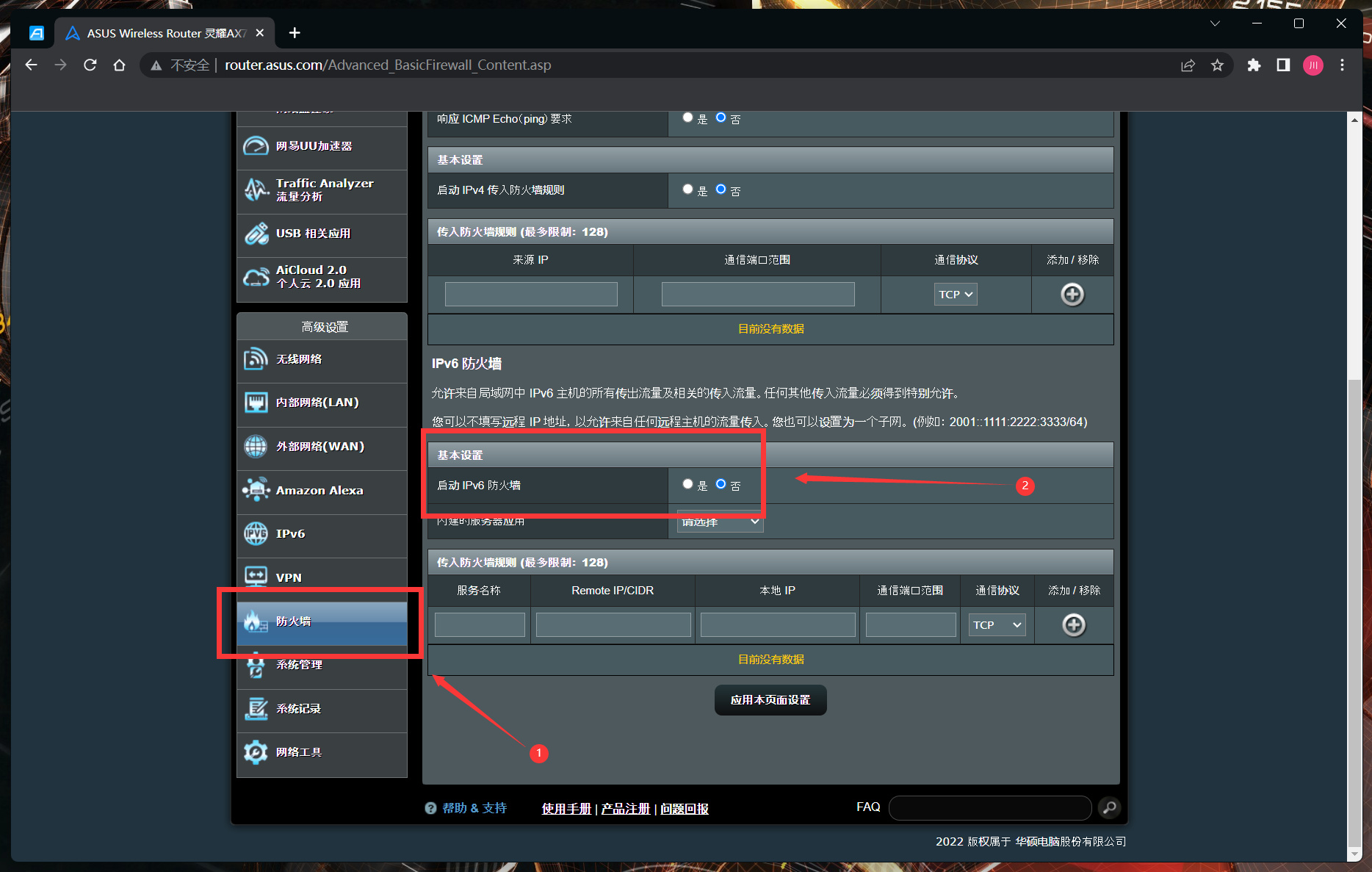 但是,大部分路由器都有獨立的IPv6防火牆配置,策略一般都比較嚴格,開啓後和沒IPv6差不多,建議關閉路由器這裏的防火牆,在電腦上開防火牆就行,防護效果不會差的。