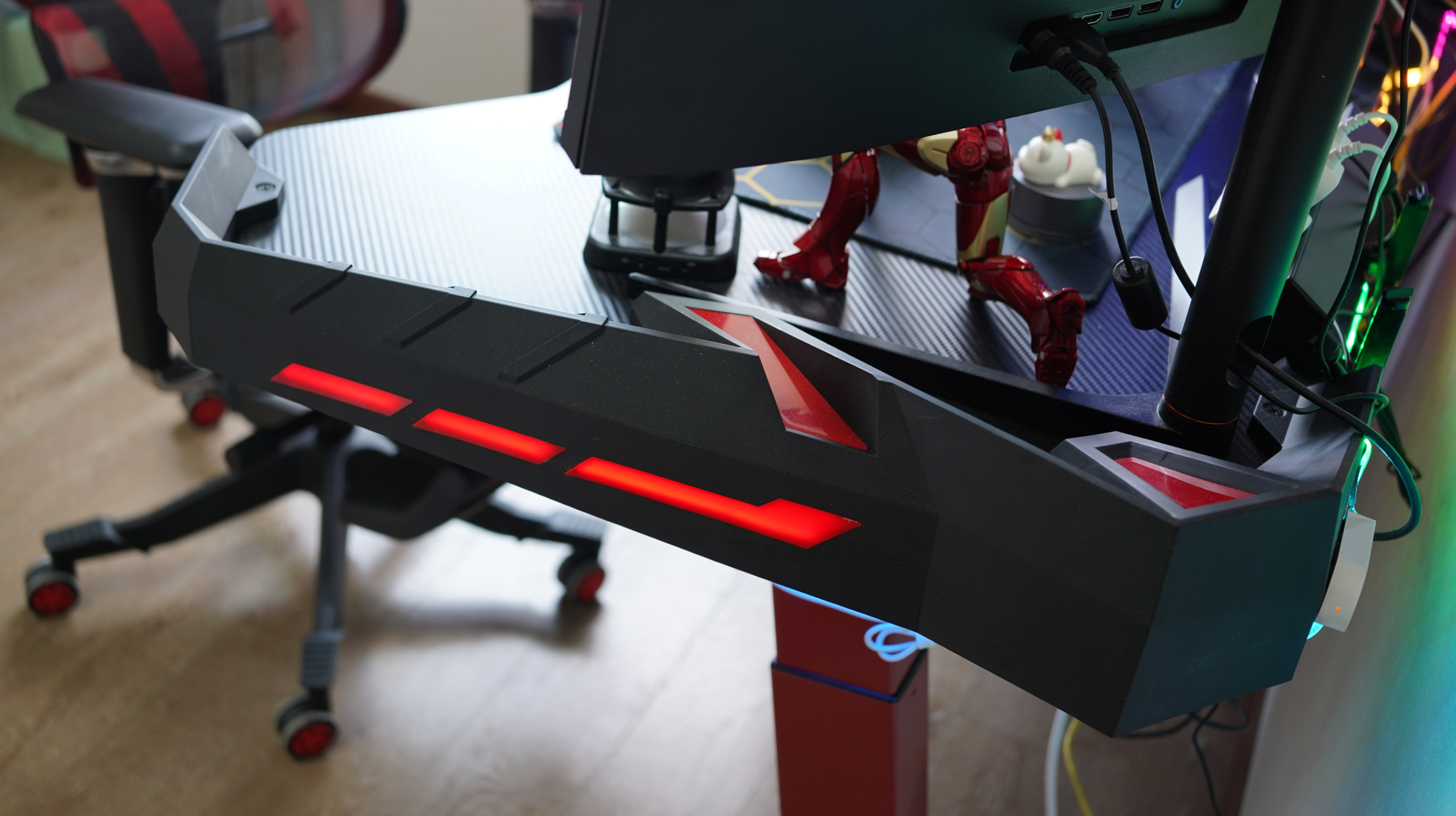 這款剛出不久的電競桌除了兩側有非常炫酷的燈效以外,結構選擇的是90*60mm+2mm厚度的Y型腳方管,理論上穩定性確實會比傳統工型結構要強上不少。