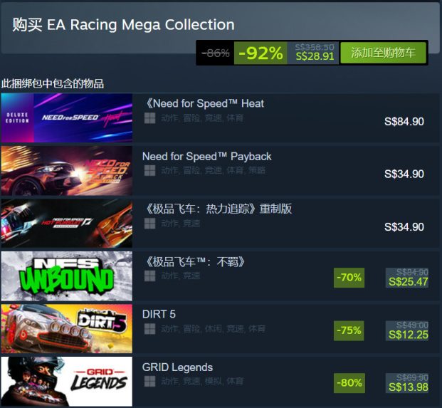 EA Racing Mega合集,一共包含六个游戏,其中最贵的就是极品飞车:不羁