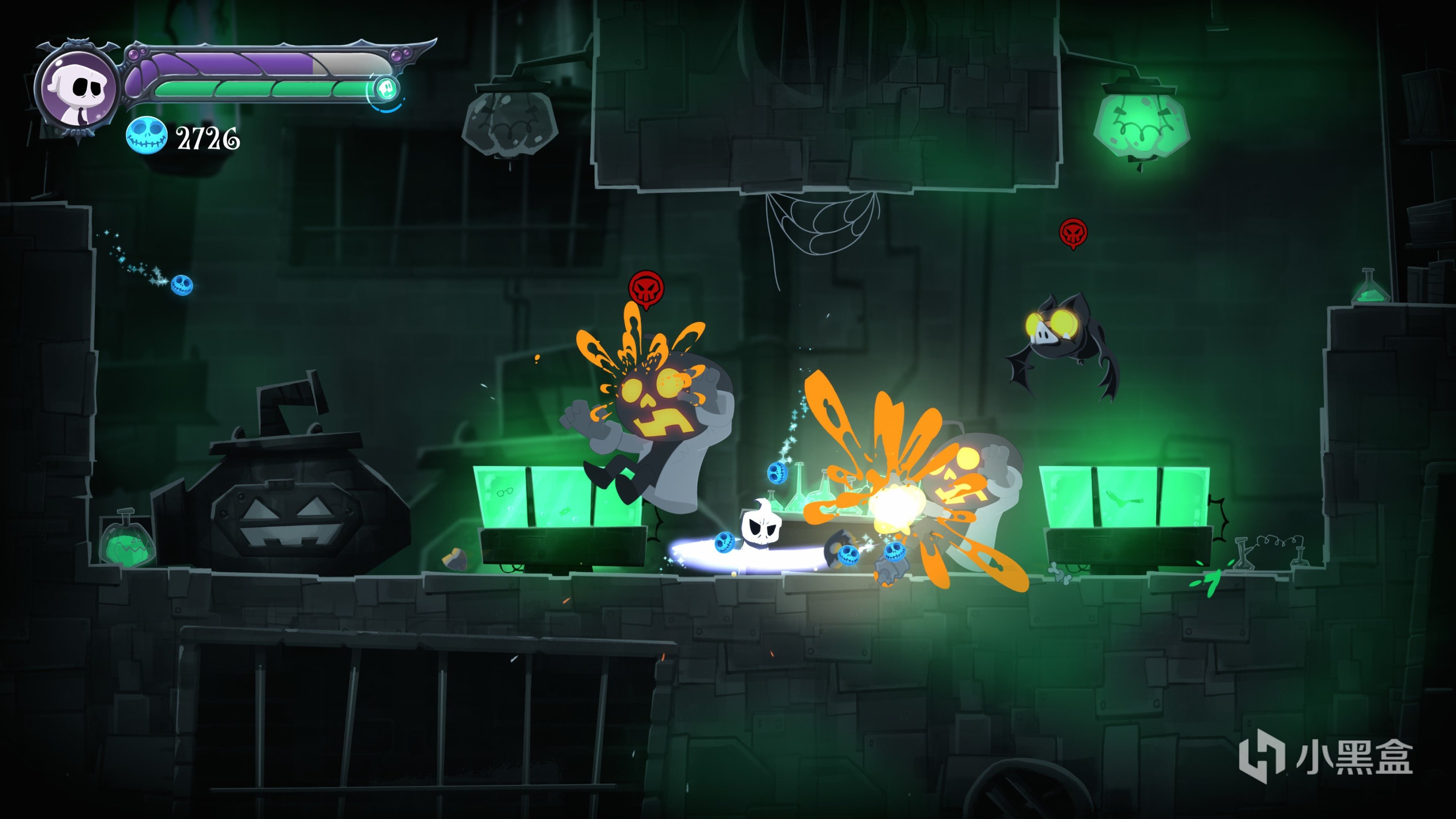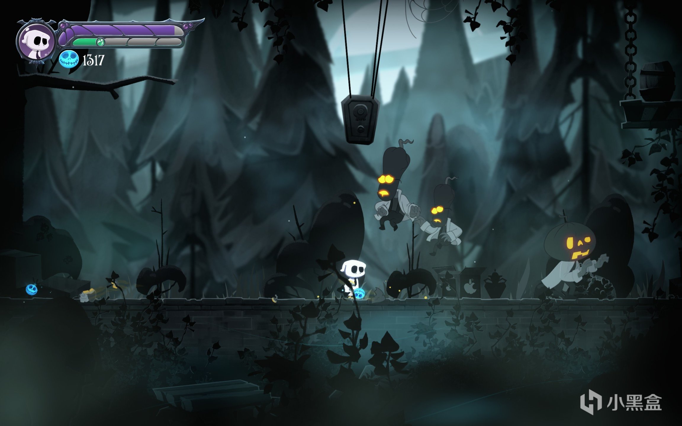 當然作爲一款橫板遊戲,製作組顯然也在遊戲內容的恐怖度方面收了一些力度,大部分人物的設計雖然符合萬聖節的諸多要素,但實際上卻顯得頗爲可愛,比如坐在椅子上休息聊天的透明小鬼,在天上飛的滑稽蝙蝠都透露着一絲可愛。
