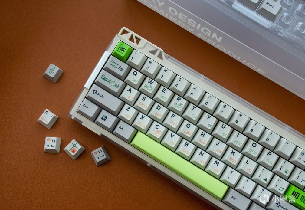 套件最引人注目的地方在於將PC材質與鋁合金材質相巧妙地結合運用。PC代表着現代元素,而鍵盤的設計採用了零件拼接和更多外露螺絲的方式,雖然這些金屬配件沒有實際功能,僅僅是爲了切割功能區而設置的穿插支撐架,但它們代表着復古工業的元素。通過這種獨特的設計手法,將現代與復古工業相結合,形成了一種嵌套的造型結構,提供了一種獨特的視覺感受,使鍵盤在虛實之間呈現出錯落有致的美感。