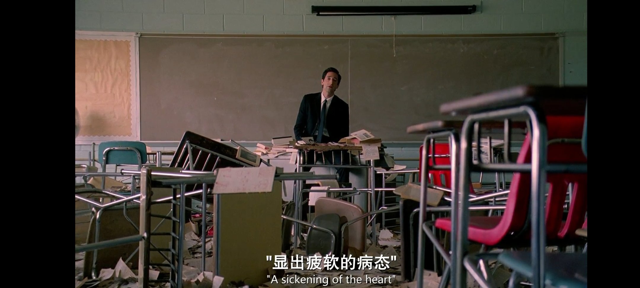 亨利,一個已經無限接近超脫的痛苦的集合體,他作爲一名代課老師,輾轉於各類學校,結識各種各樣的人與靈魂。他本該漠視他身處的環境的周遭一切,他本該身體置於其中,靈魂超越天外,但是他沒有那麼做,面對着一個又一個孤寂而憂傷的靈魂,他選擇了面對一切,悲憫世界。