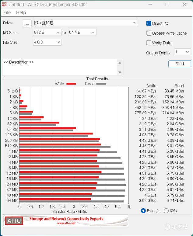 ATTO Disk Benchmarks QD1项目,设定大小是4GB,0.5KB区间读写速度分别为38MB /s和60MB /s,在1KB区间之后就呈现翻倍趋势,直到12MB~16MB达到读写最大速度5800/4500MB /s,比上述软件和官方标称都要高,毕竟算法不同也会影响跑分的。