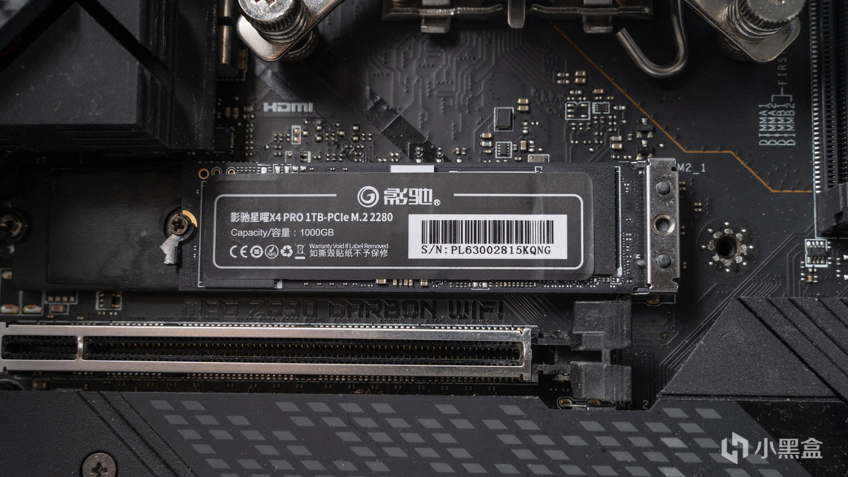 星曜X4 PRO 1TB安装在主板第一条M.2插槽,便捷卡扣设计无需拧螺丝挺方便,使用主板自带散热片辅助。这个位置理论上热量积聚会更多一些,对固态硬盘也是一种高压考验。