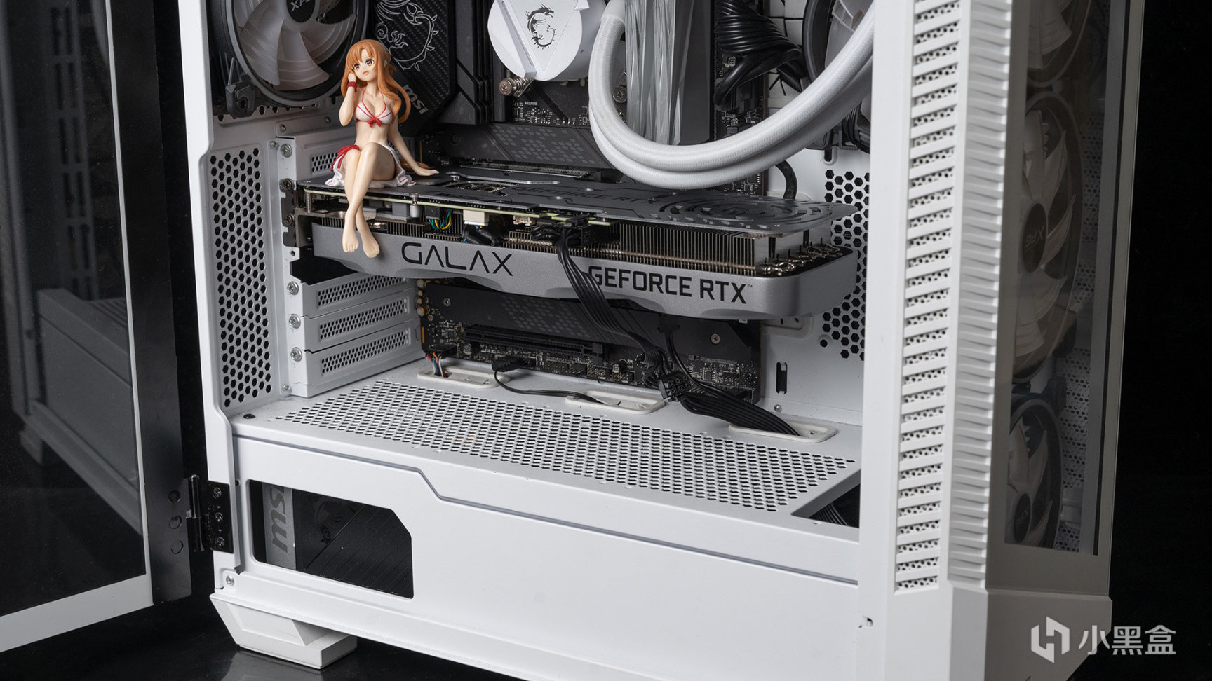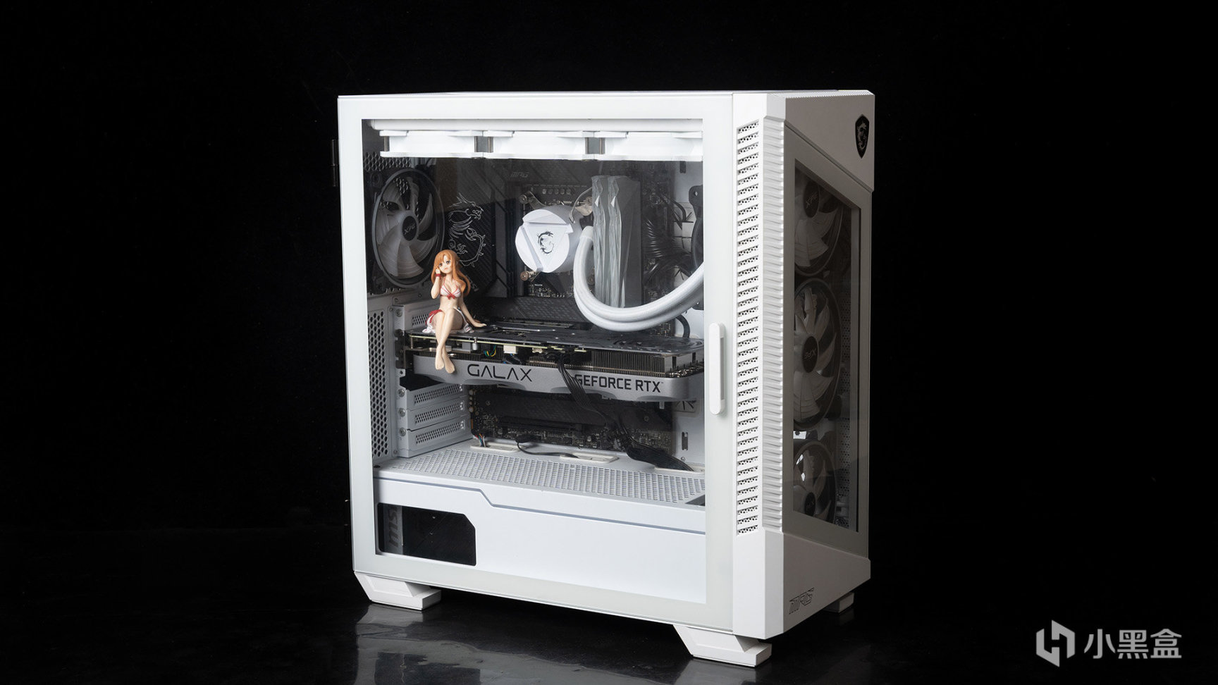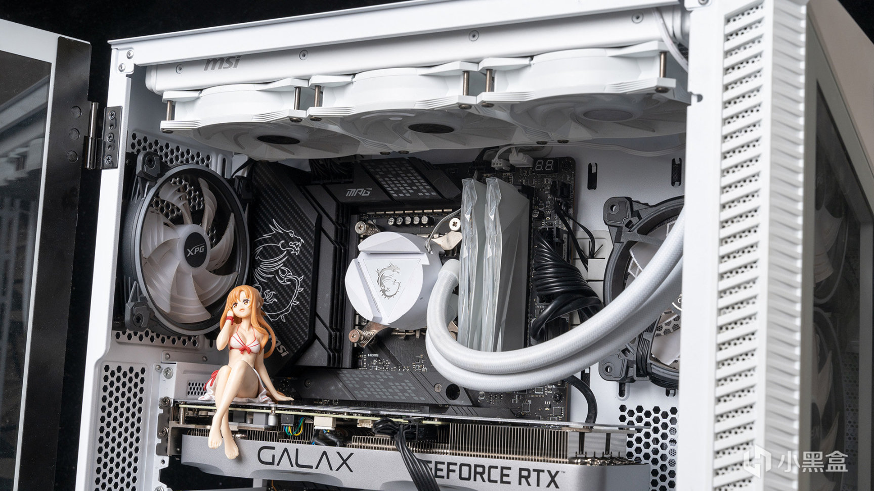 CPU是Core i7-13700K,散热器是微星的寒冰360R V2白色版本,冷头上有龙纹LOGO,可自由选择适应不同装机方案,而这款水冷的水泵是安置在冷排上,可最大程度降低噪声,而水冷安装在顶部,日常状态下也可充当机箱风扇,顶部位置也是最佳的。