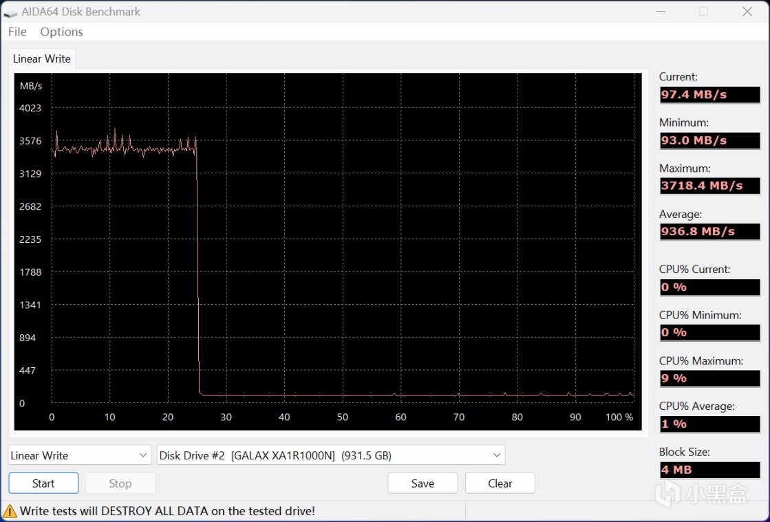 使用AIDA64进行SLC Cache全盘写入测试,星曜X4 PRO 1TB在25%进度时可以保持3500 MB/s,这个区间就是有SLC Cache写入的时间段,容量大概约为200GB左右,SLC缓存用完后,断崖式跌落至100 MB/s左右直至全盘写完,全程平均写入速度是936 MB/s,整体表现符合QLC颗粒的特性。